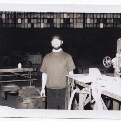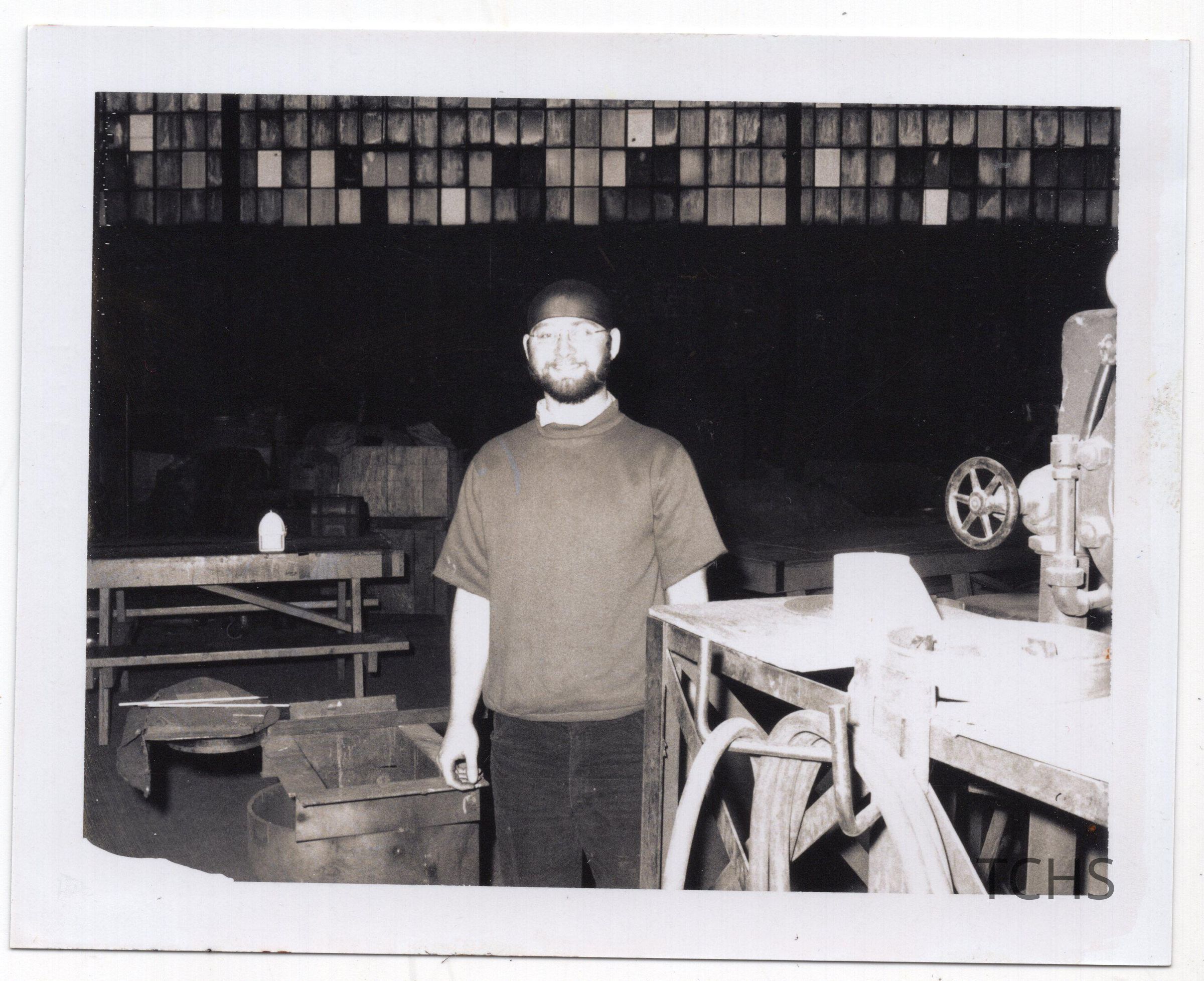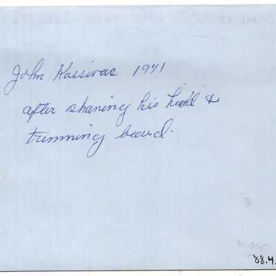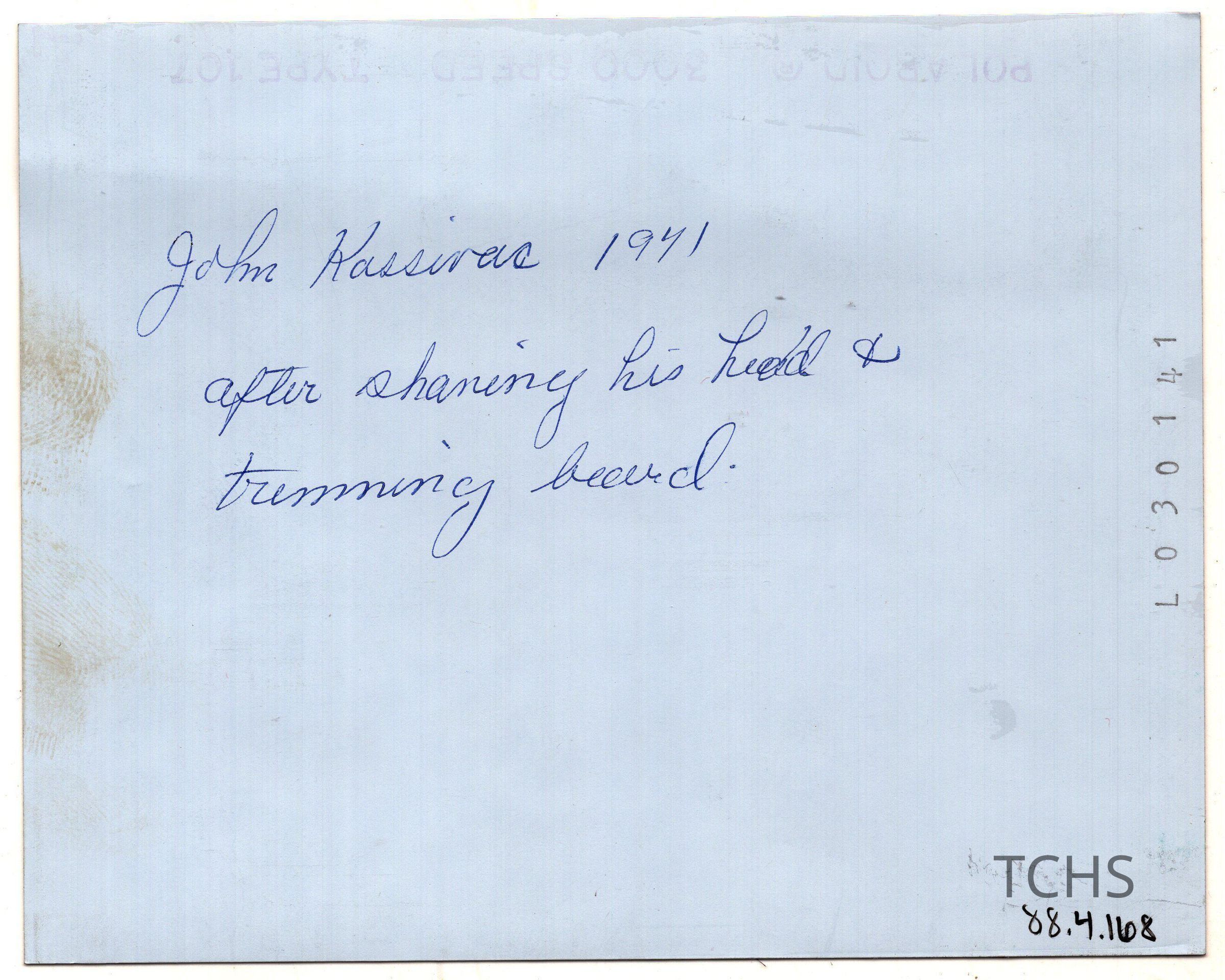 Image of John Kassivas in factory room "after shaving his head + trimming beard". Information written on back.Acquisition
