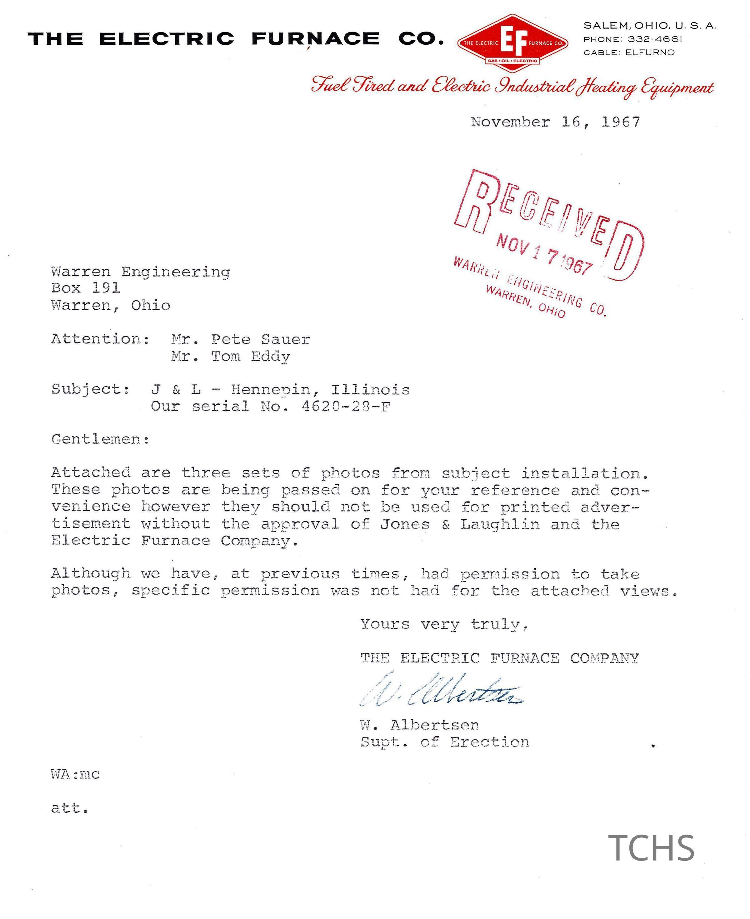 Letter to The Warren Engineering Company from The Electric Furnace Company regarding Jones & Laughlin installation photos taken in Hennepin, Illinois.Acquisition