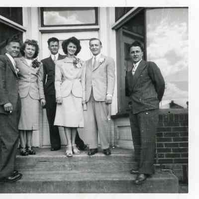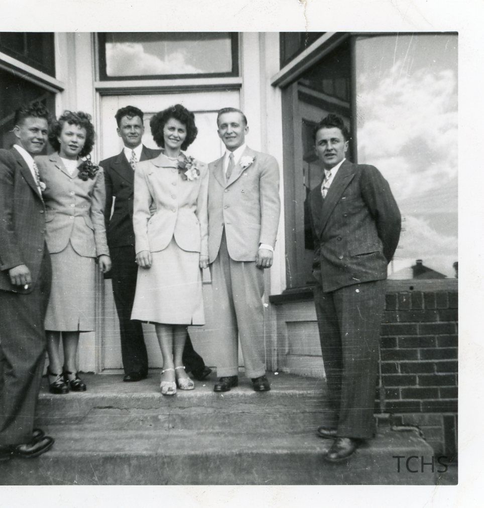 A photograph, from left to right, of Joseph Peresie, Margaret Futey, Henry Peresie, Marcella Futey, Joseph Futey, and Edward Peresie outside of 1957 Highland Ave.Acquisition