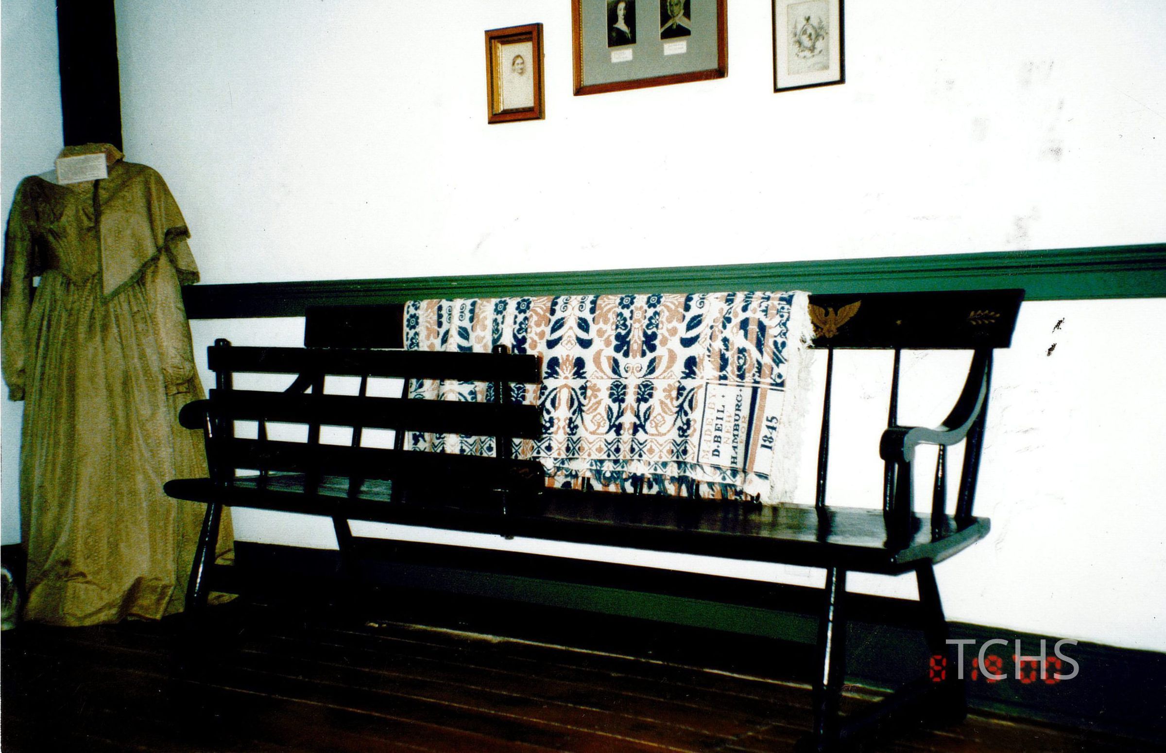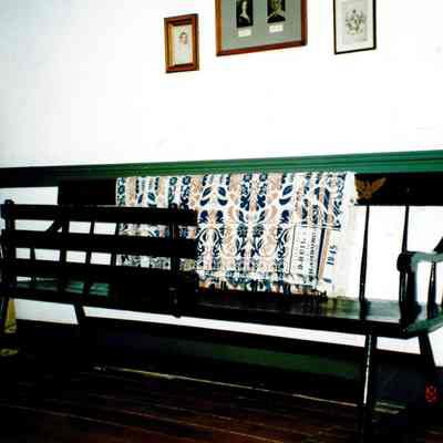 Interior of the John Stark Edwards house showing a black bench in the downstairs parlor with a green dress. Photo taken August 19, 2000.Location