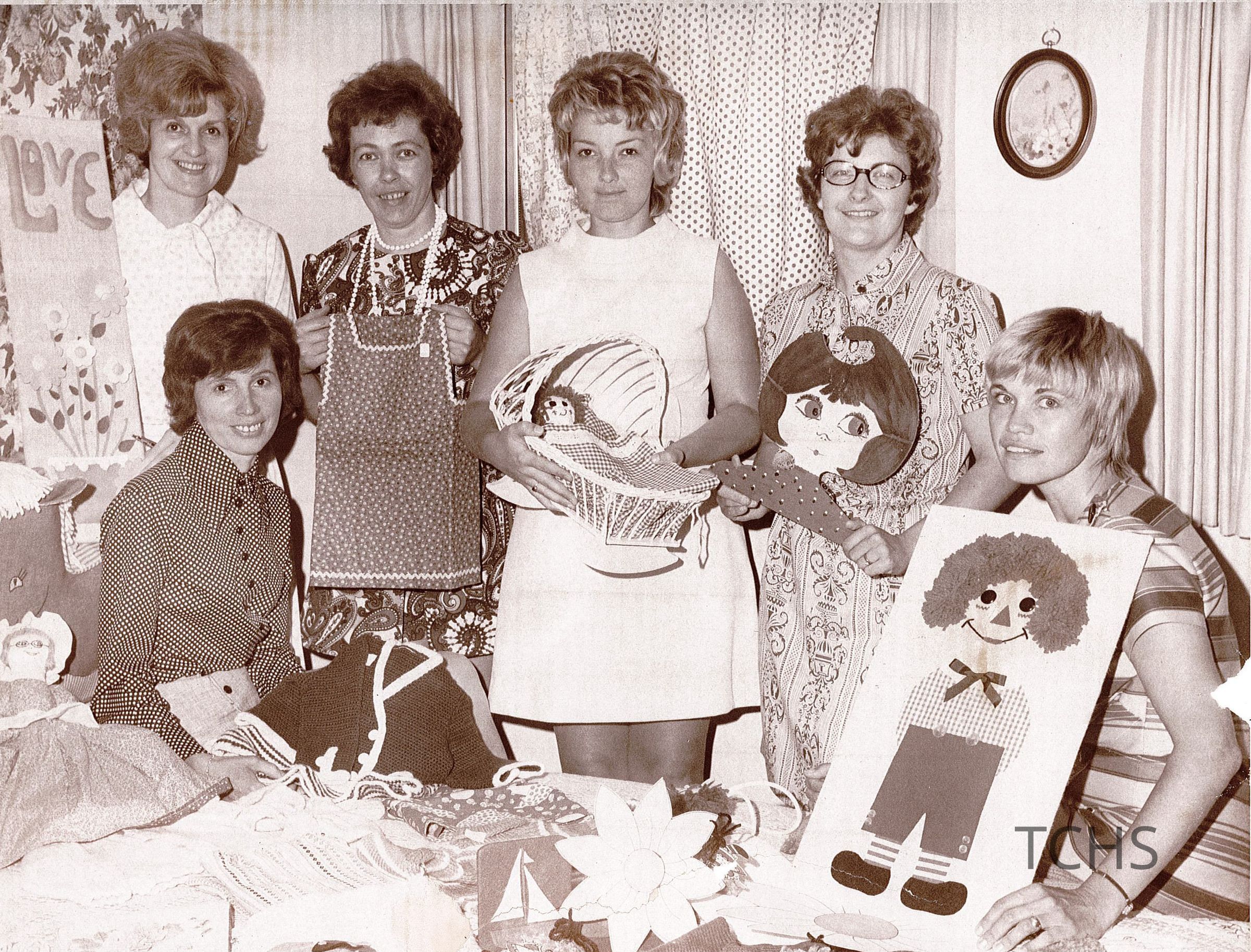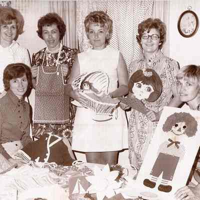 Standing L-R: Mrs. Daniel Machusak, 1971 Bazaar chair; Mrs. Alfred Teachout, country store; Mrs. Clarence Latimer, knitting; Mrs. Jack Kier, paintingAcquisition