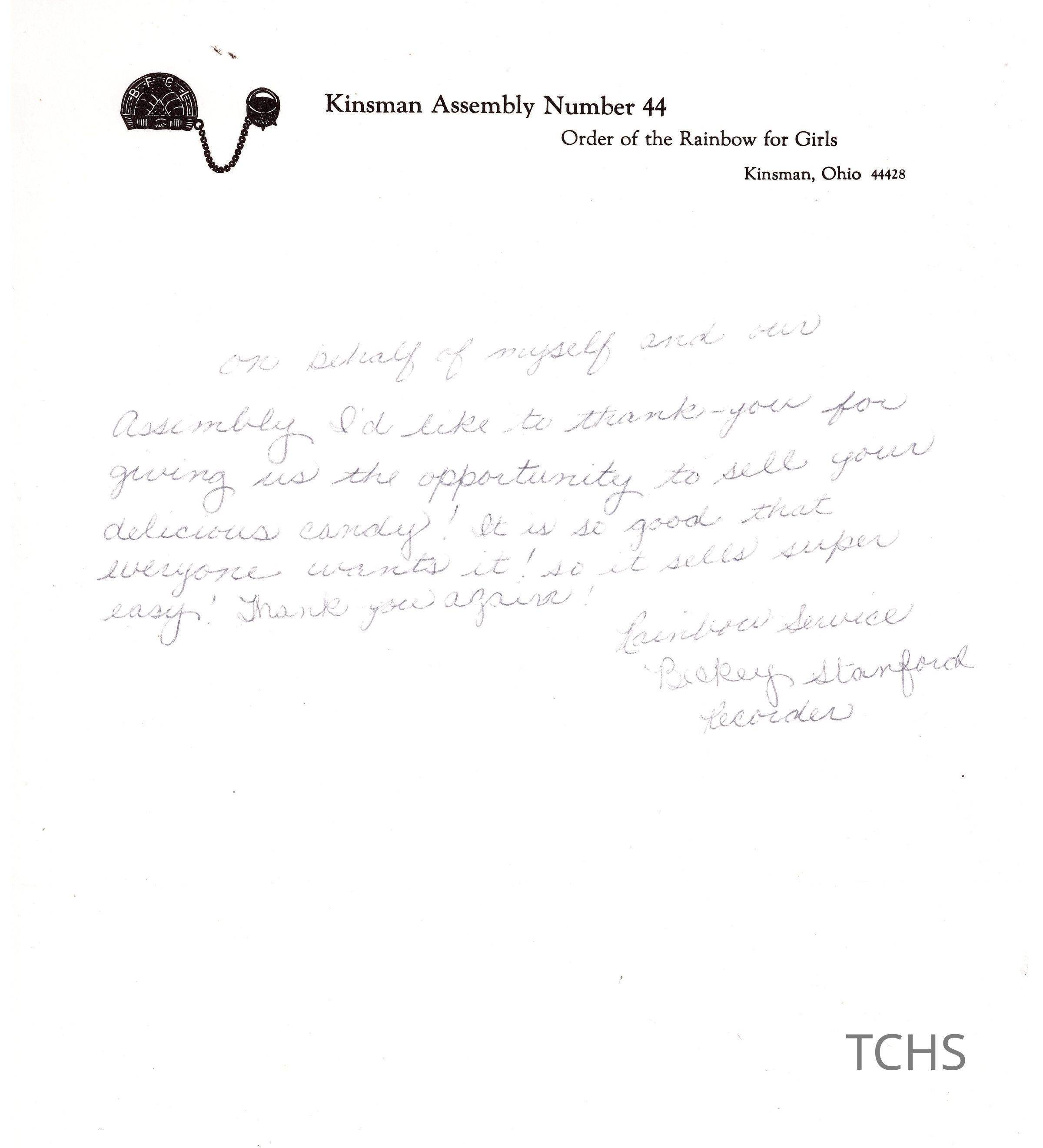 Kinsman Assembly 44 Letter, 1958Entry/Object ID
