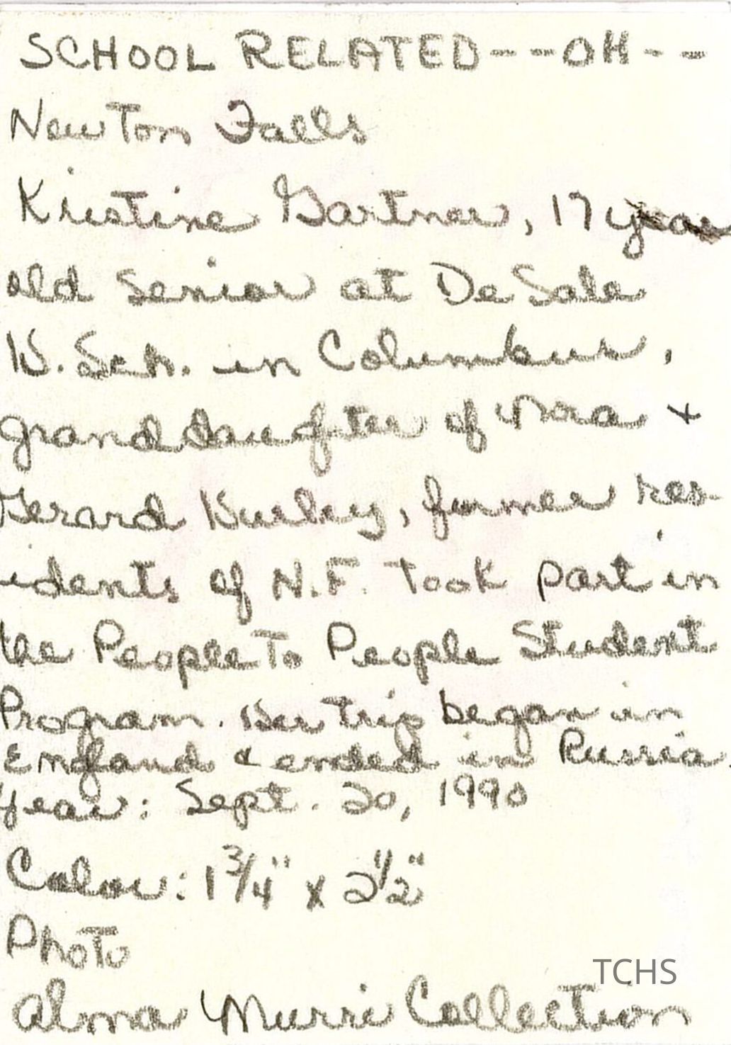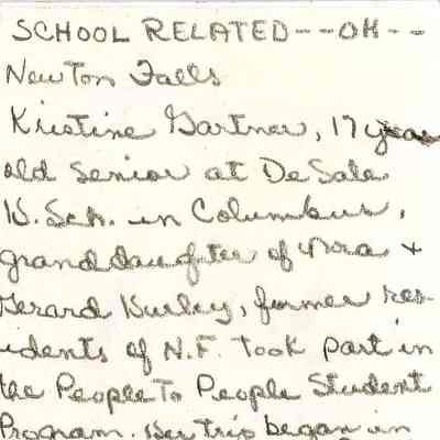 "Kristin Garter, a 17-year-old senior at DeSala W. School in Columbus, granddaughter of Nora and Gerald Hurley, former residents of Newton Falls took part in the People to People student program. Her trip began in England and ended in Russia."