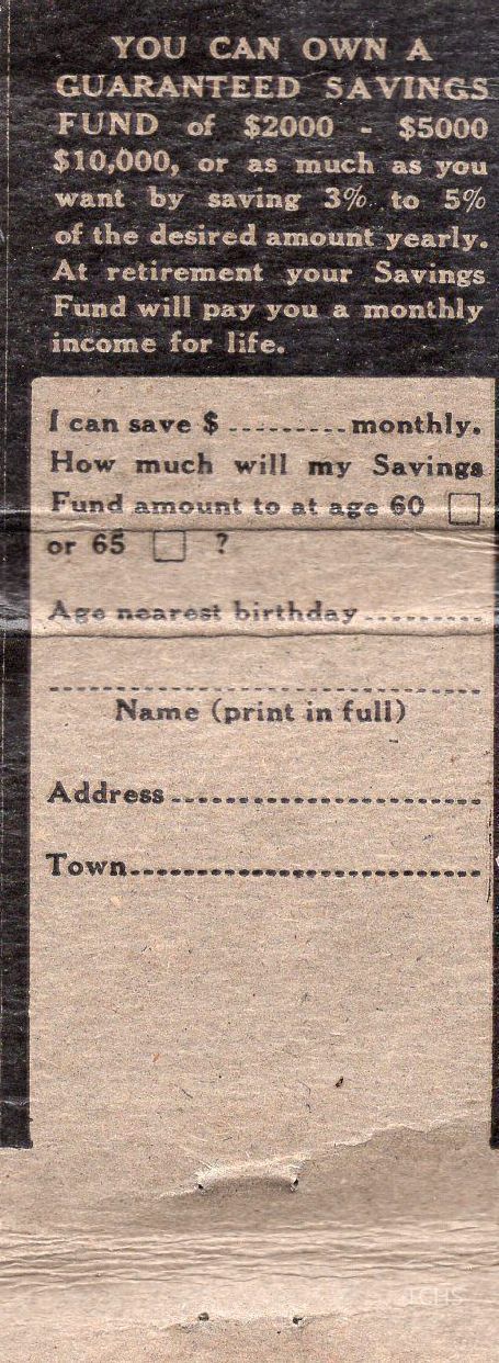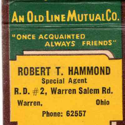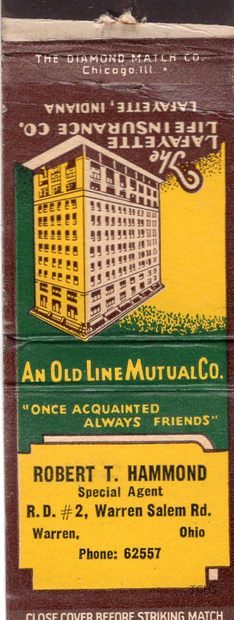 An undated matchbook for agent Robert T. Hammond of The Lafayette Life Insurance Company, located on Salem Road in Warren, OH.Acquisition