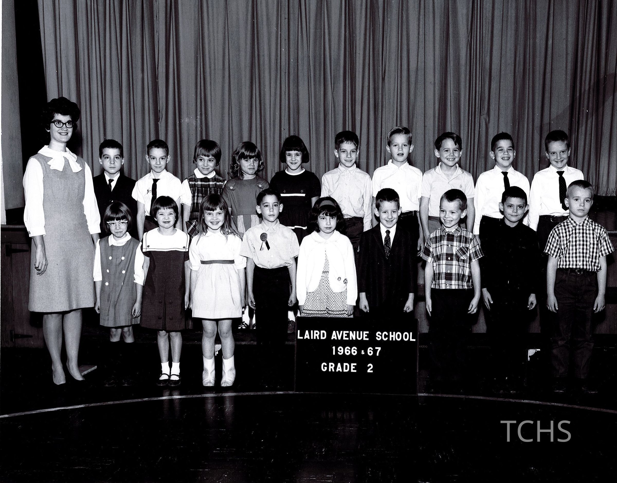 Laird Avenue Elementary 1966-67 Grade 2 class photo. Teacher pictured alongside students.Collection