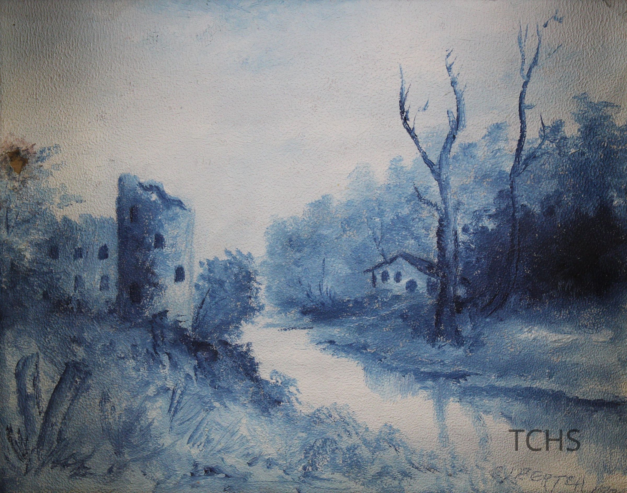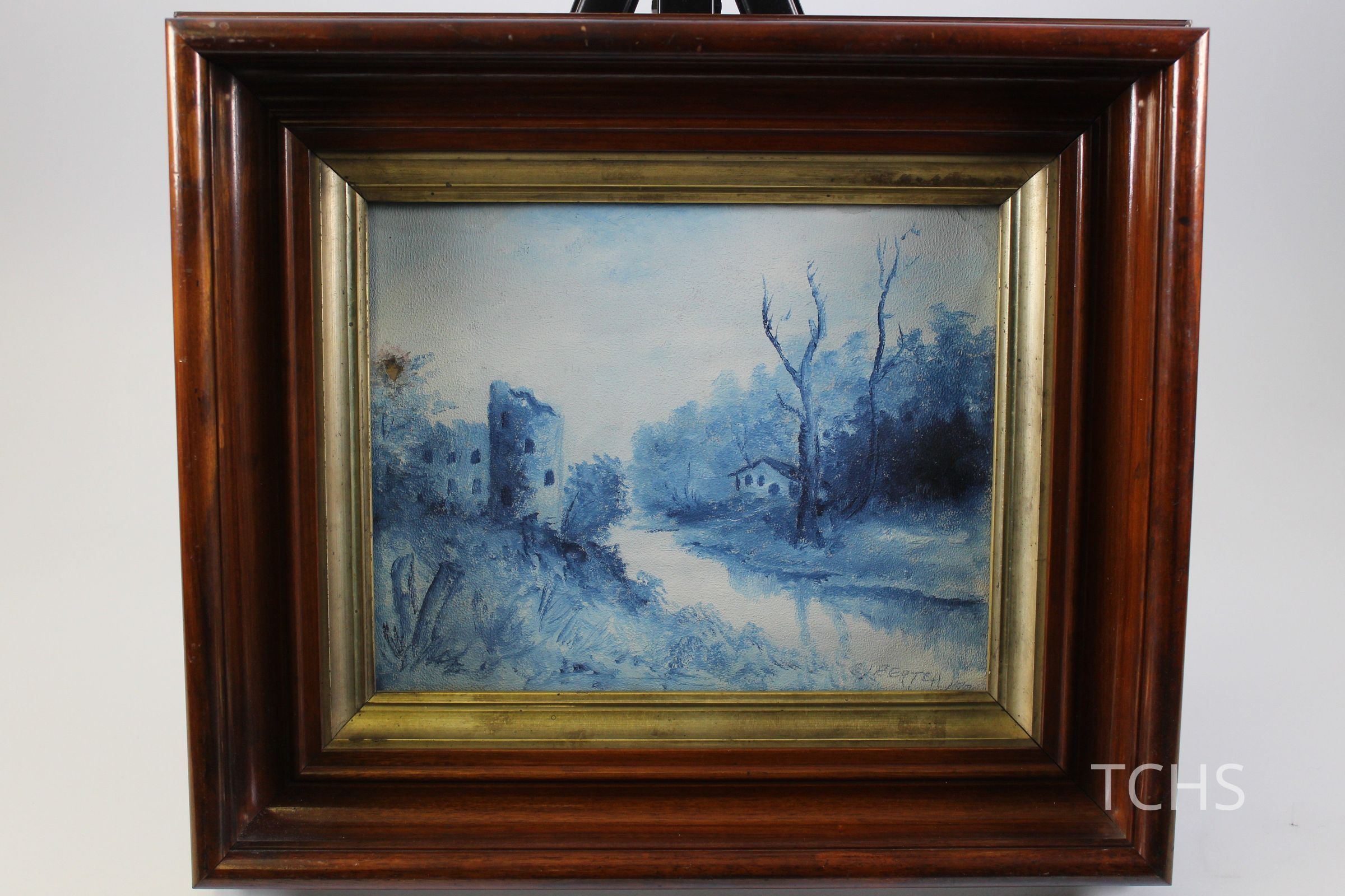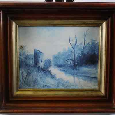 A framed blue tones painting of a landscape with a river, signed by artist - signature unreadable.Acquisition