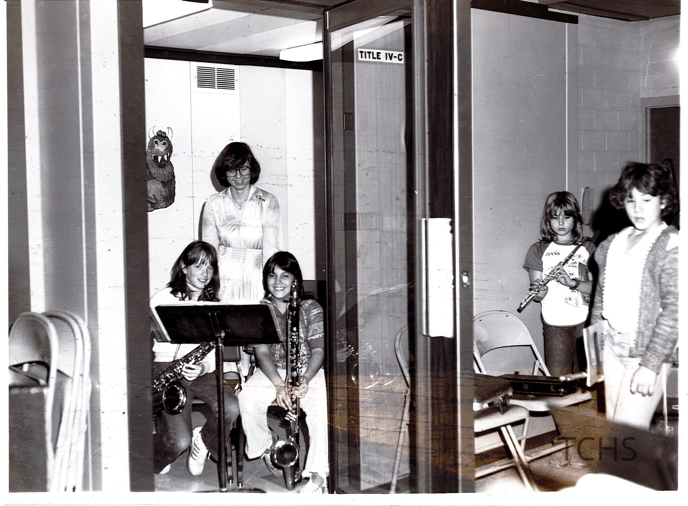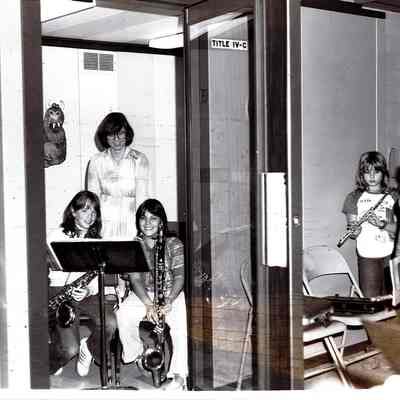 "Students at Leavitt Elementary in the music program can practice and receive instruction without interference or distractions in the new sound-proof module. Ann Marie Geddes and Sabrina Torres are shown with Joan Theis, elementary band director."