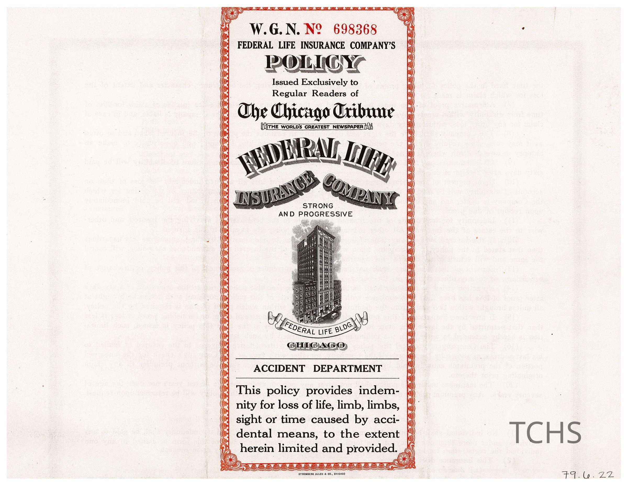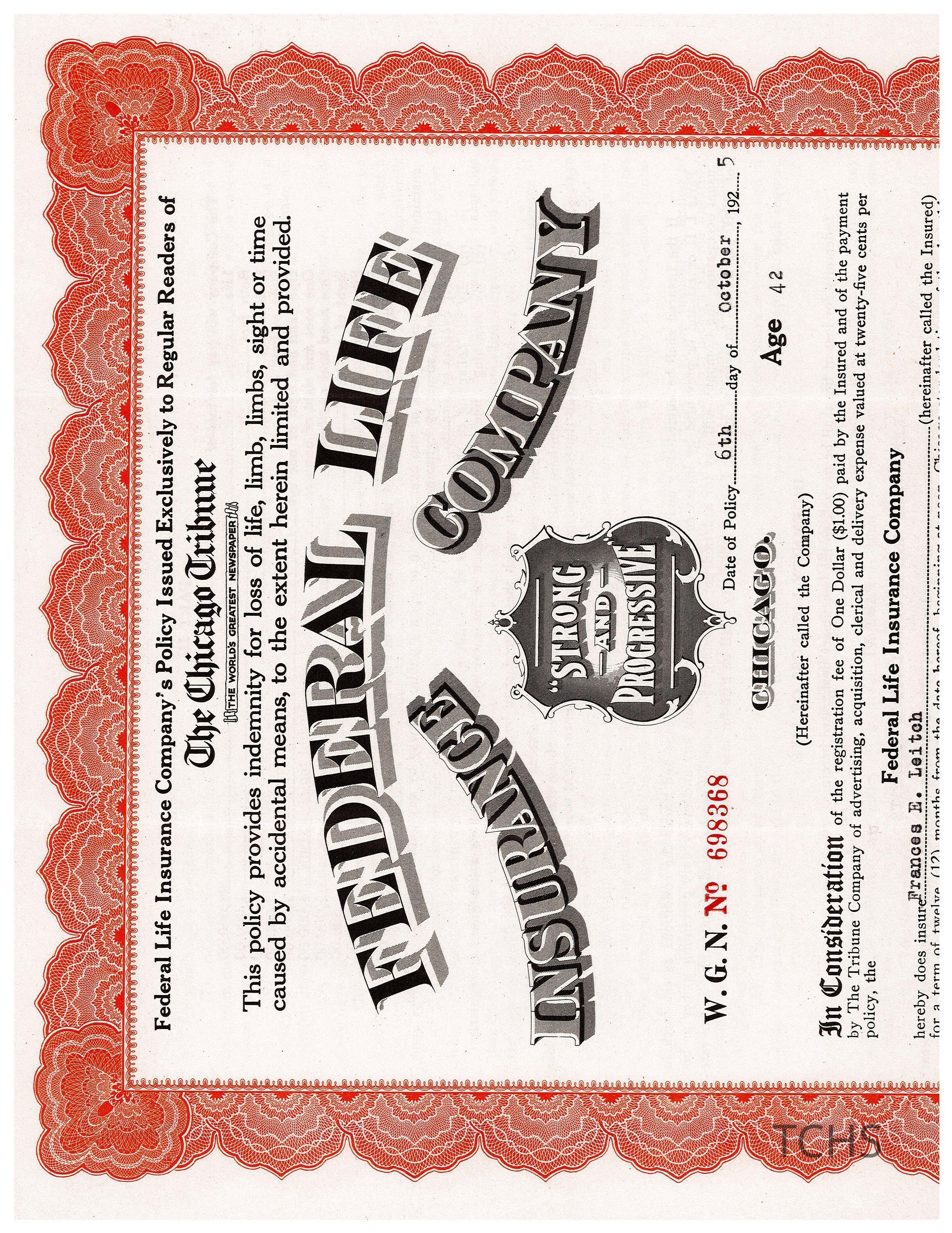 Federal Life Insurance Policy for Frances E. Leitch, 1925