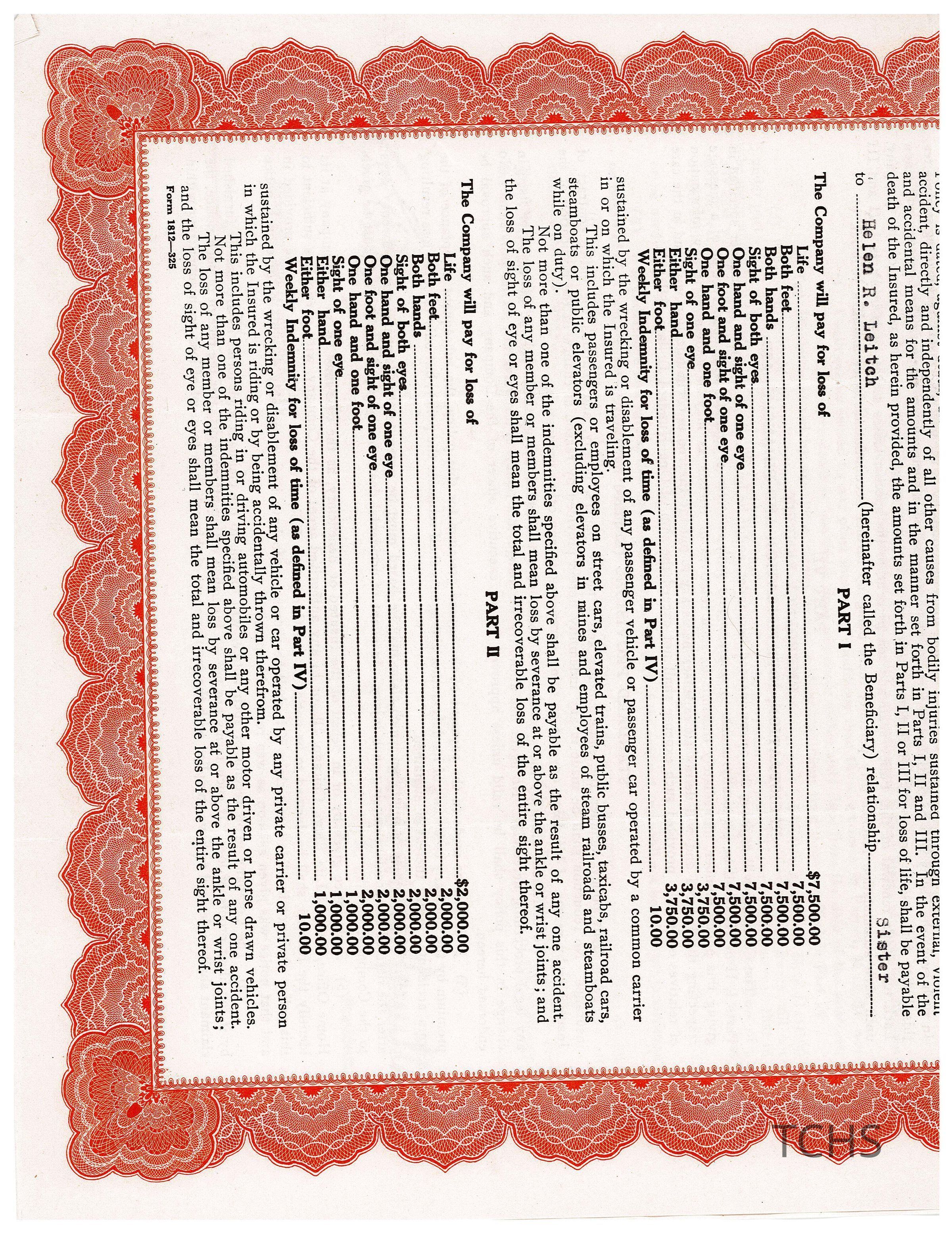 Leitch Insurance Policy, 1925Entry/Object ID