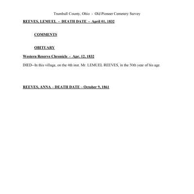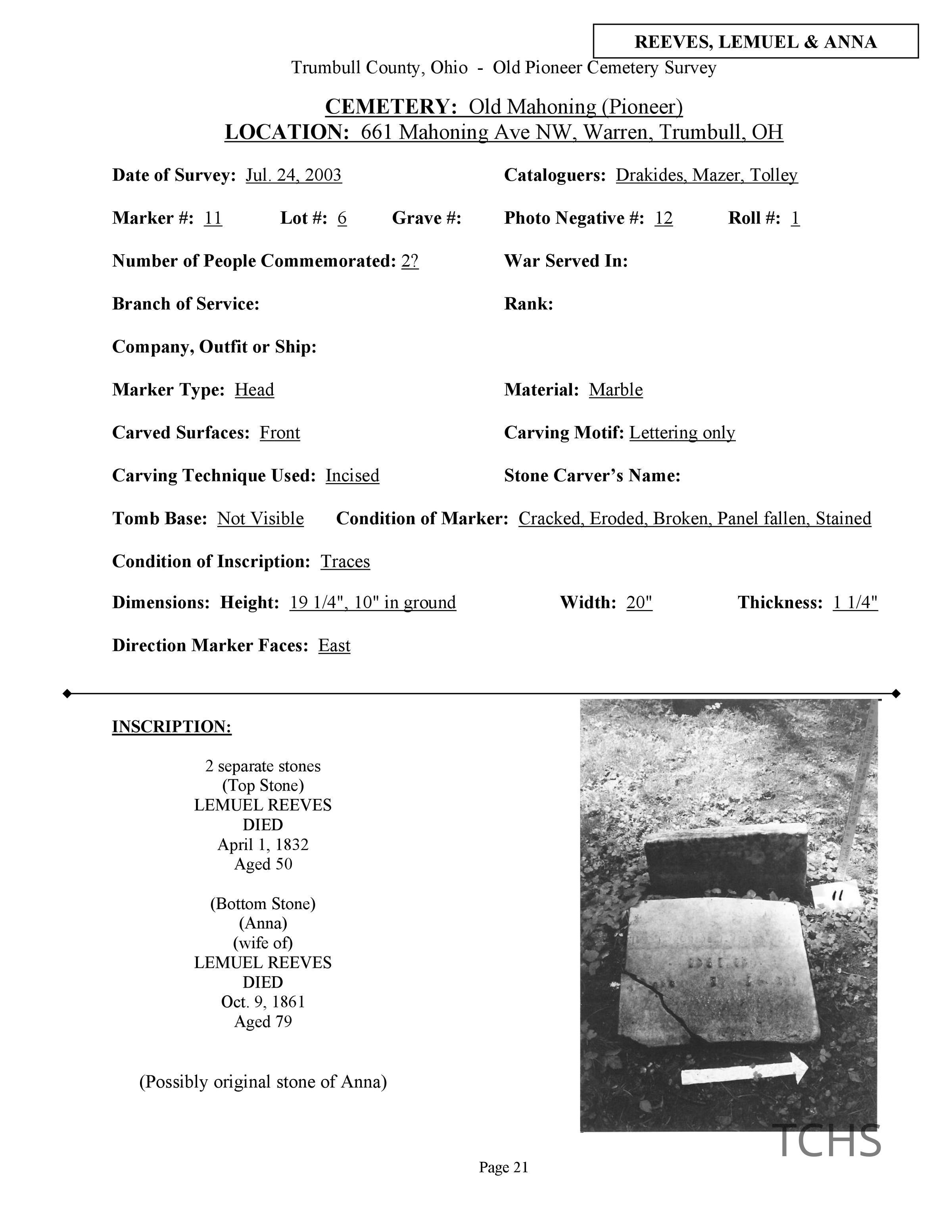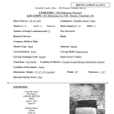This page was compiled by the Trumbull County Genealogical Society during a 2002-2004 survey of Old Mahoning Cemetery.Creator