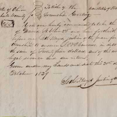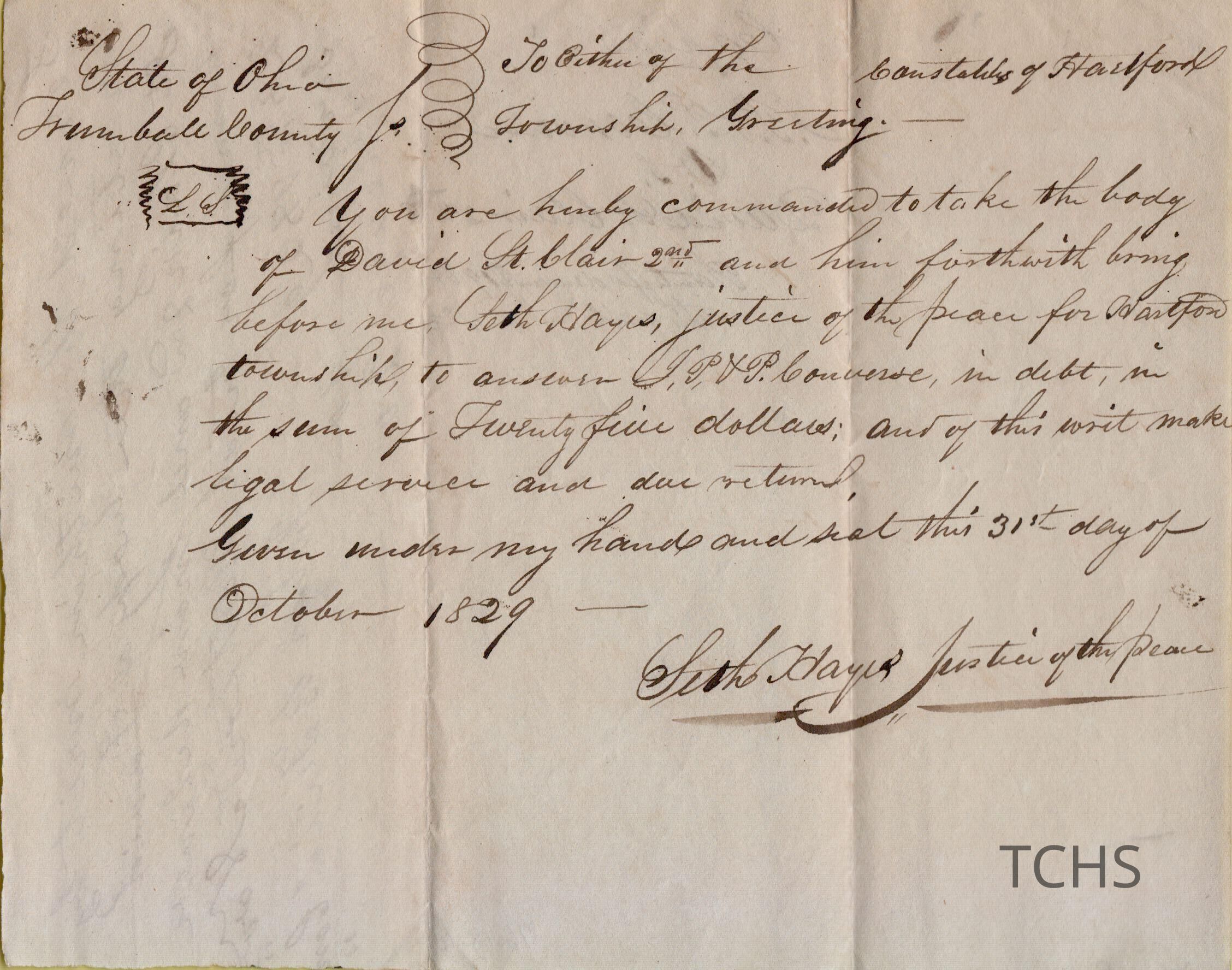Court order to the constable of Hartford Township from Justice Seth Hayes