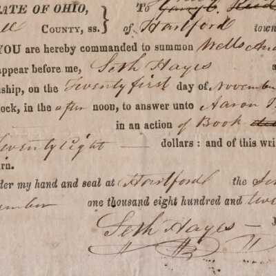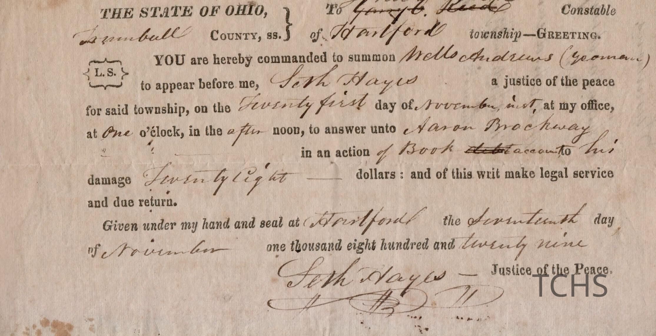 Letter to constable of Hartford Township from Justice Seth Hayes