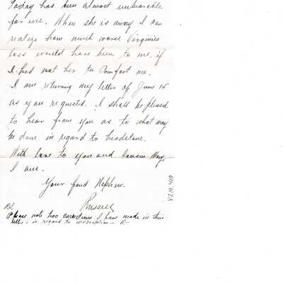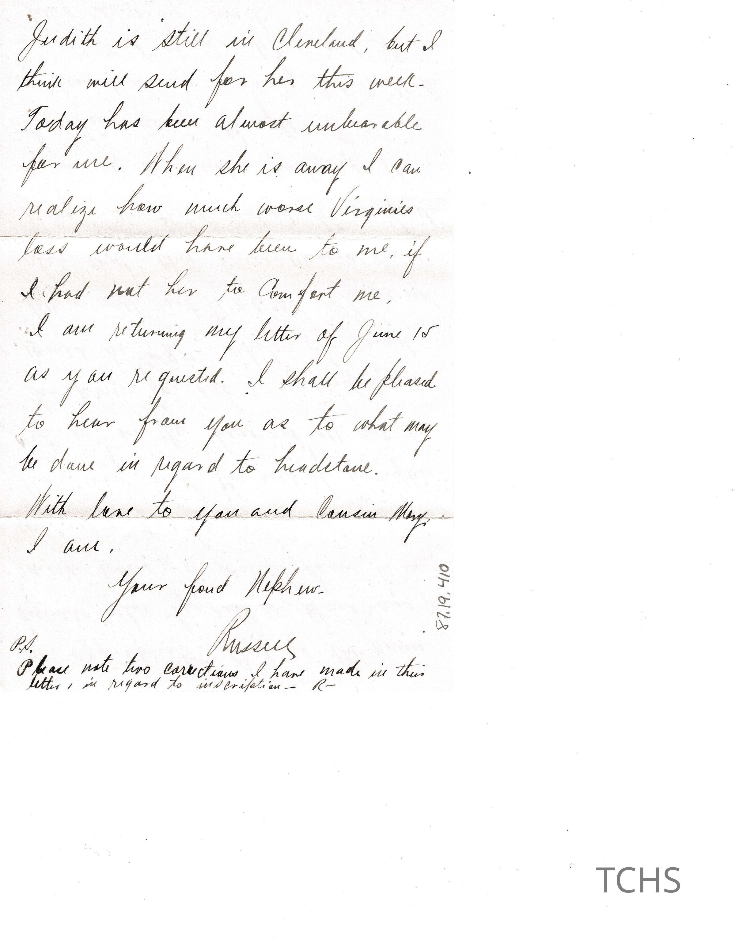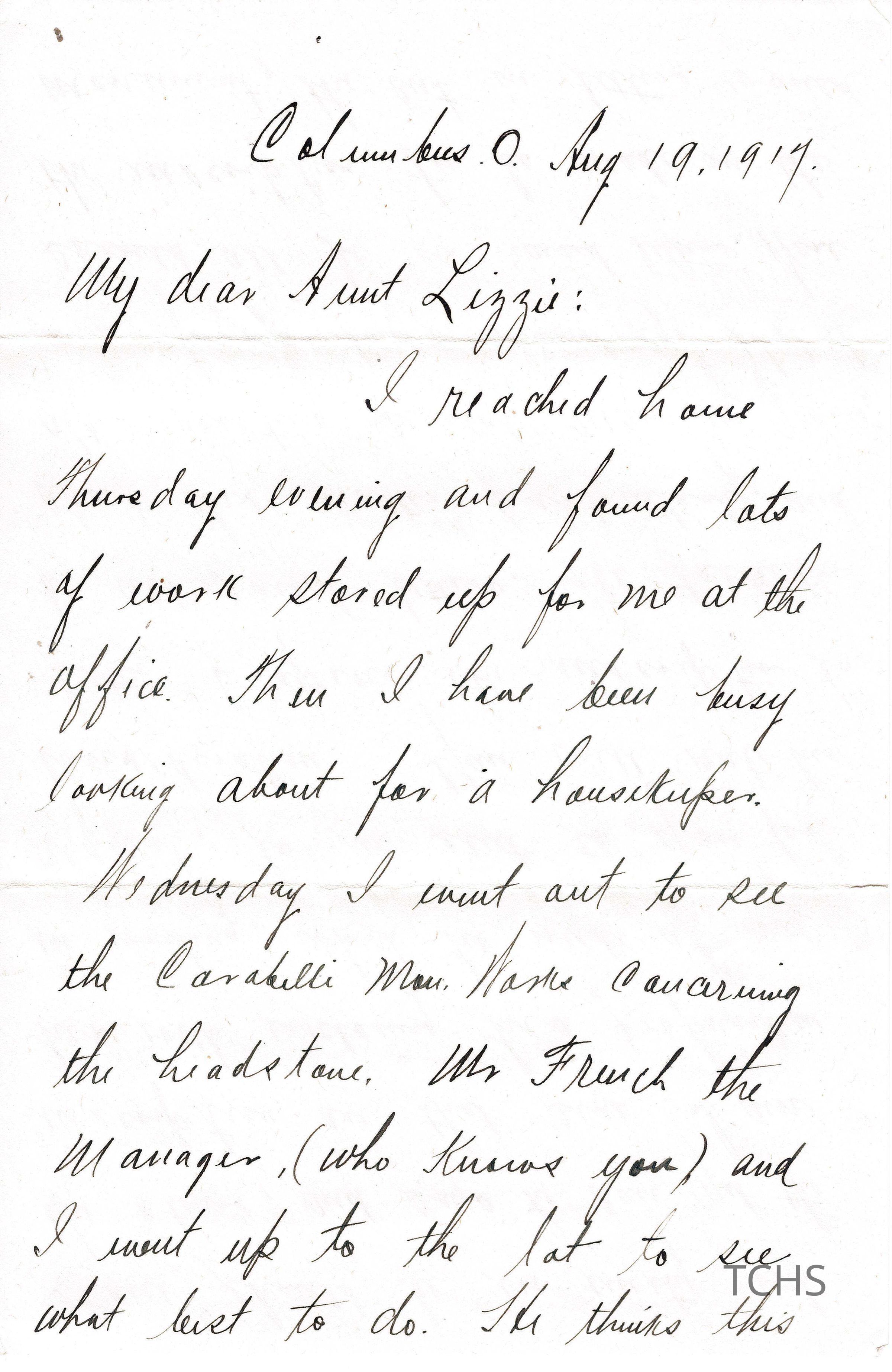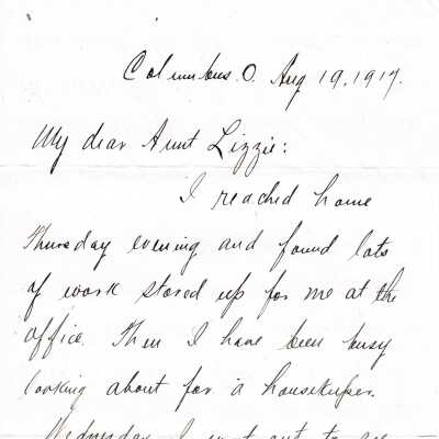 Letter, Aug. 19, 1917 from Nephew Russell Swinehart to Aunt Lizzle Baldwin. Found with the records of Baldwin plots at Lake View cemetery.Acquisition