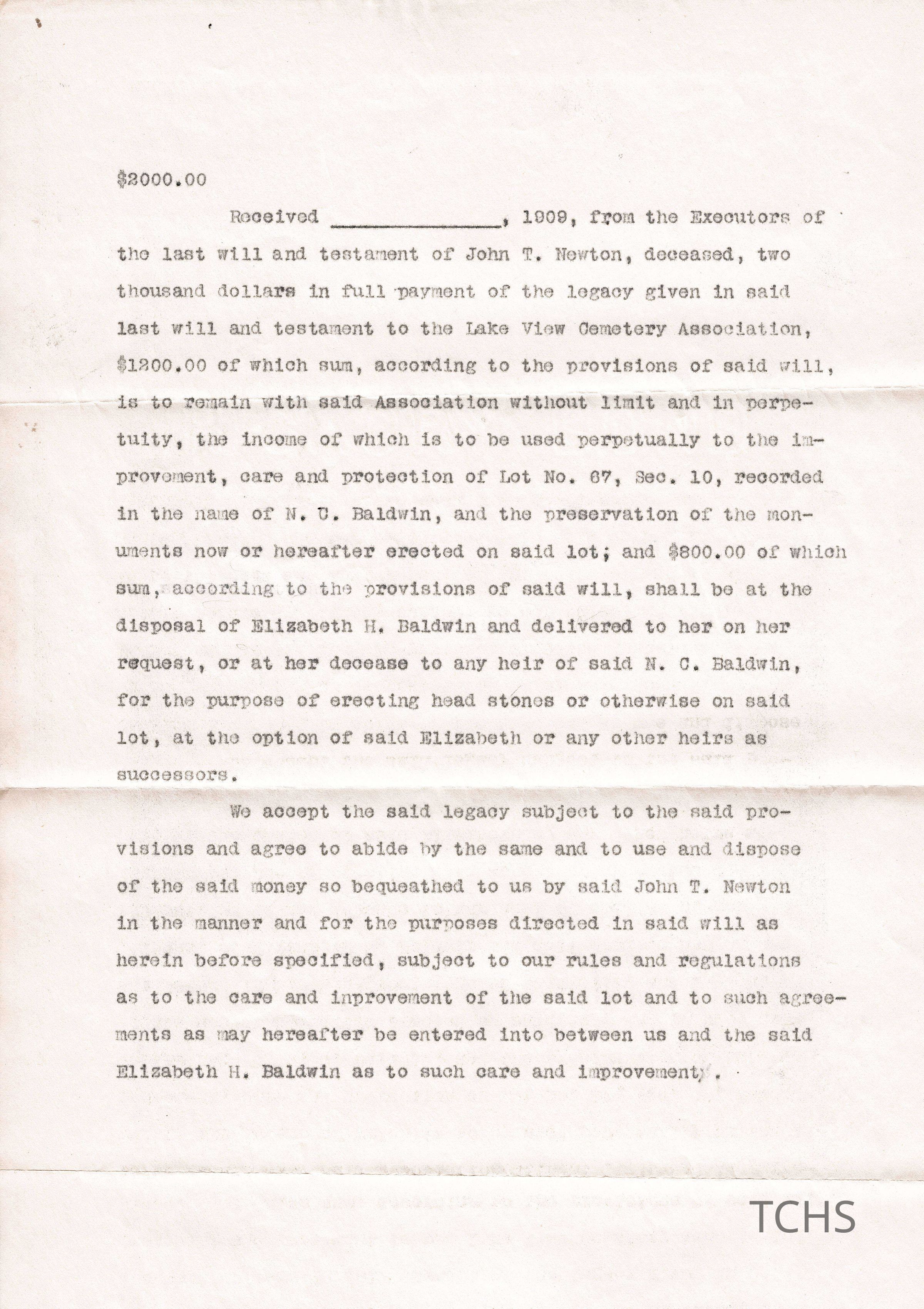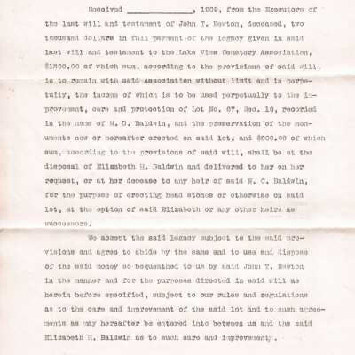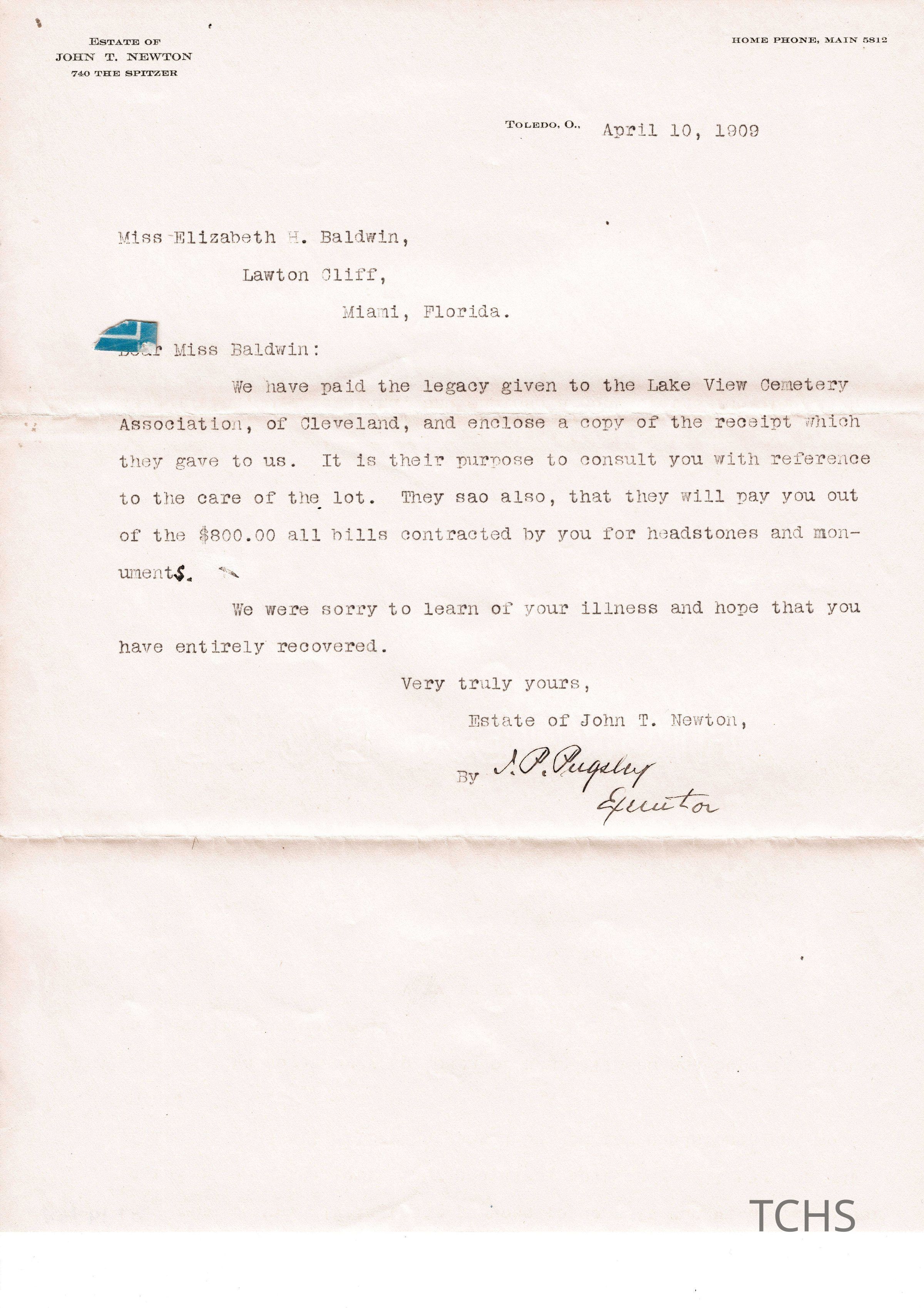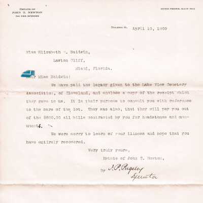 Letter, Estate of John Newton to Elizabeth Baldwin, 1909. Includes a receipt with regards to the Lake View Cemetery Baldwin plots.Acquisition