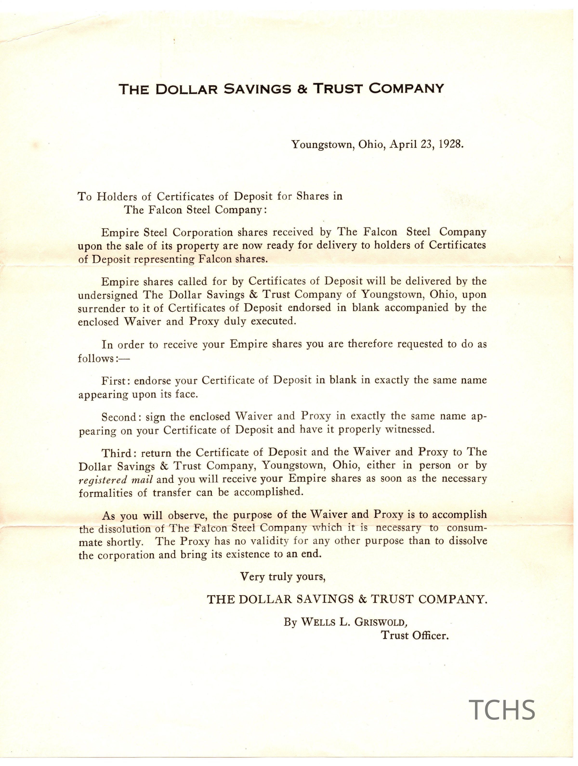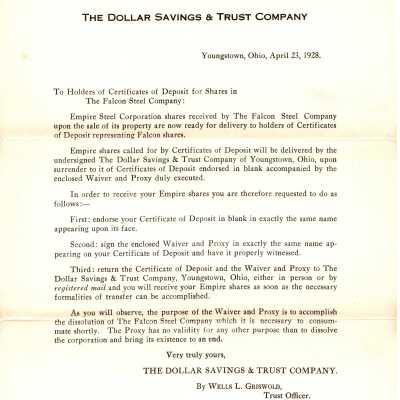 Letter from the Dollar Savings & Trust Company to Holders of Certificates of Deposit for Shares in The Falcon Steel Company indicating how to receive their Empire shares.Acquisition