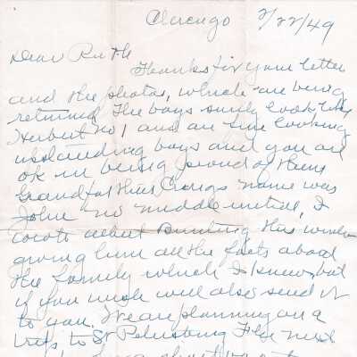 Letter from Will Veits to Ruth (Craig?), dated February 22, 1949.