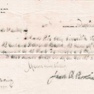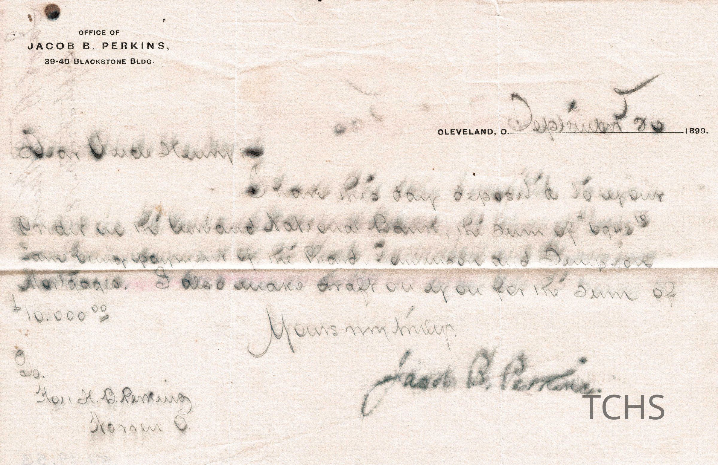 Letter, Sep 20 1899, From Jacob B. Perkins to Uncle Henry Bishop Perkins regarding funds deposited to H.B.P. Letter is blurred and hard to read.Acquisition