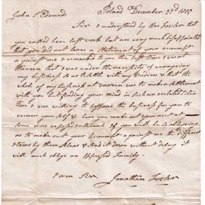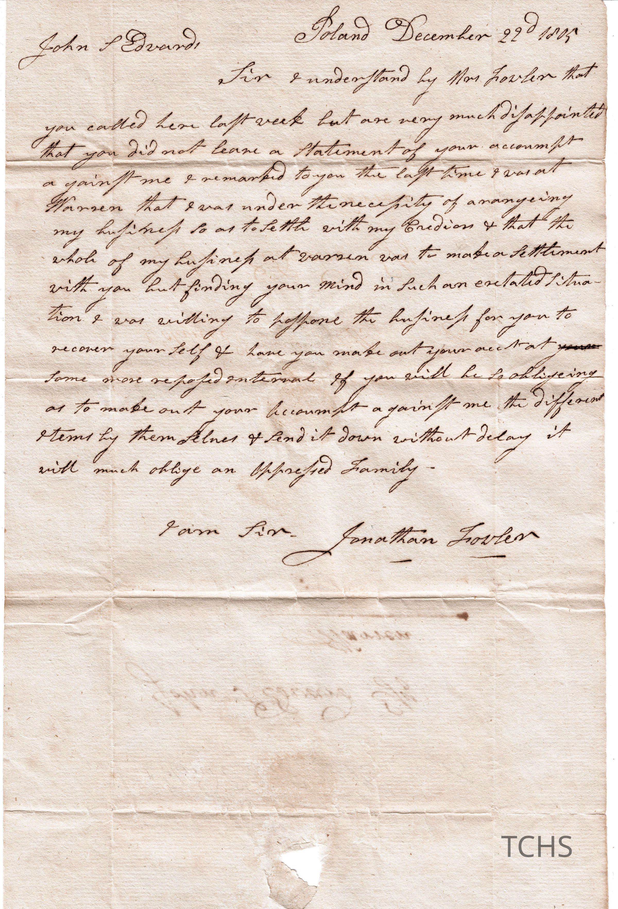 Letter to John Stark Edwards from Jonathan Fowler dated December 22 1805 or 1809.Location