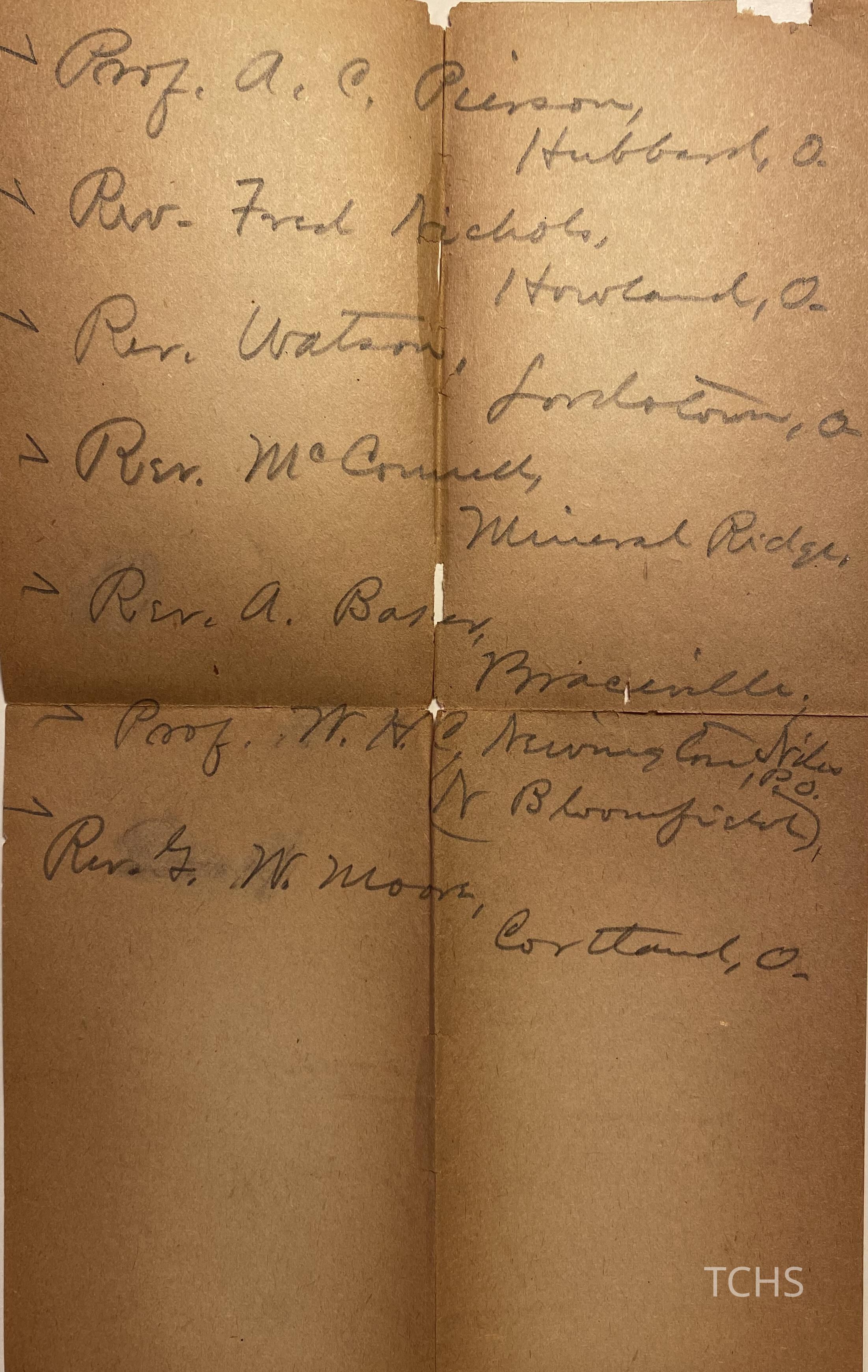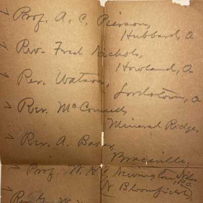 List of reverends - Prof. A. C. Pierson, Hubbard; Rev. Fred Nichols, Howland; Rev. Watson, Lordstown; Rev. McConnell, Mineral Ridge; Rev. A. Baner, Braceville; Prof. W. H. C. Newing, Niles, N. Bloomfield; Rev. G. W. Moore, Cortland