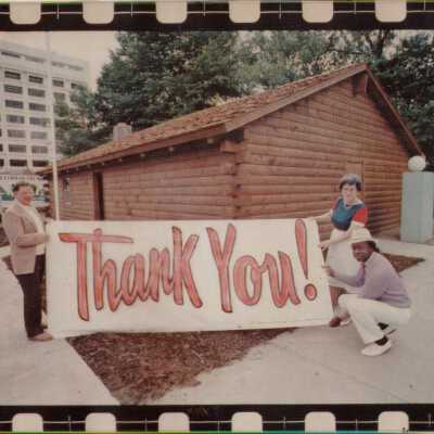 Log Cabin in downtown Warren with Thank You! Banner