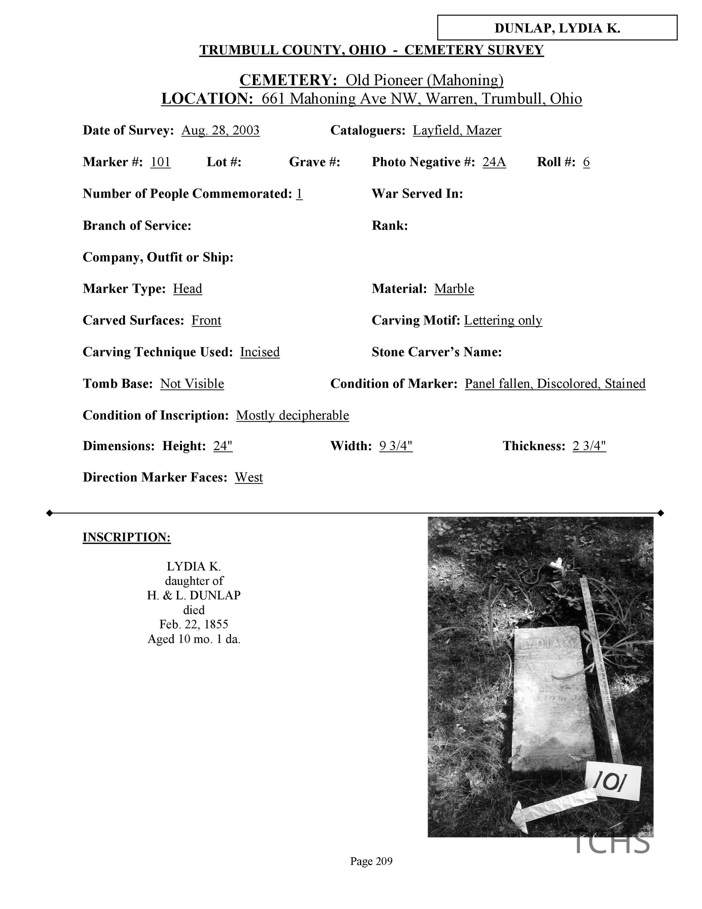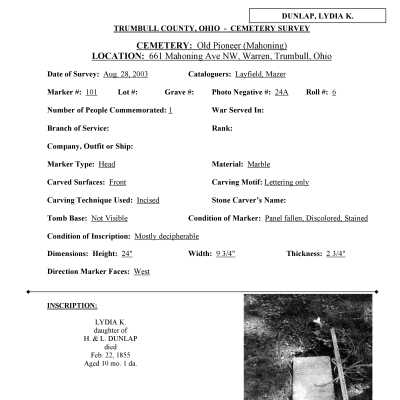 Lydia K. Dunlap died February 22, 1855 at the age of 10 months and is buried at the Old Mahoning (Pioneer) Cemetery.