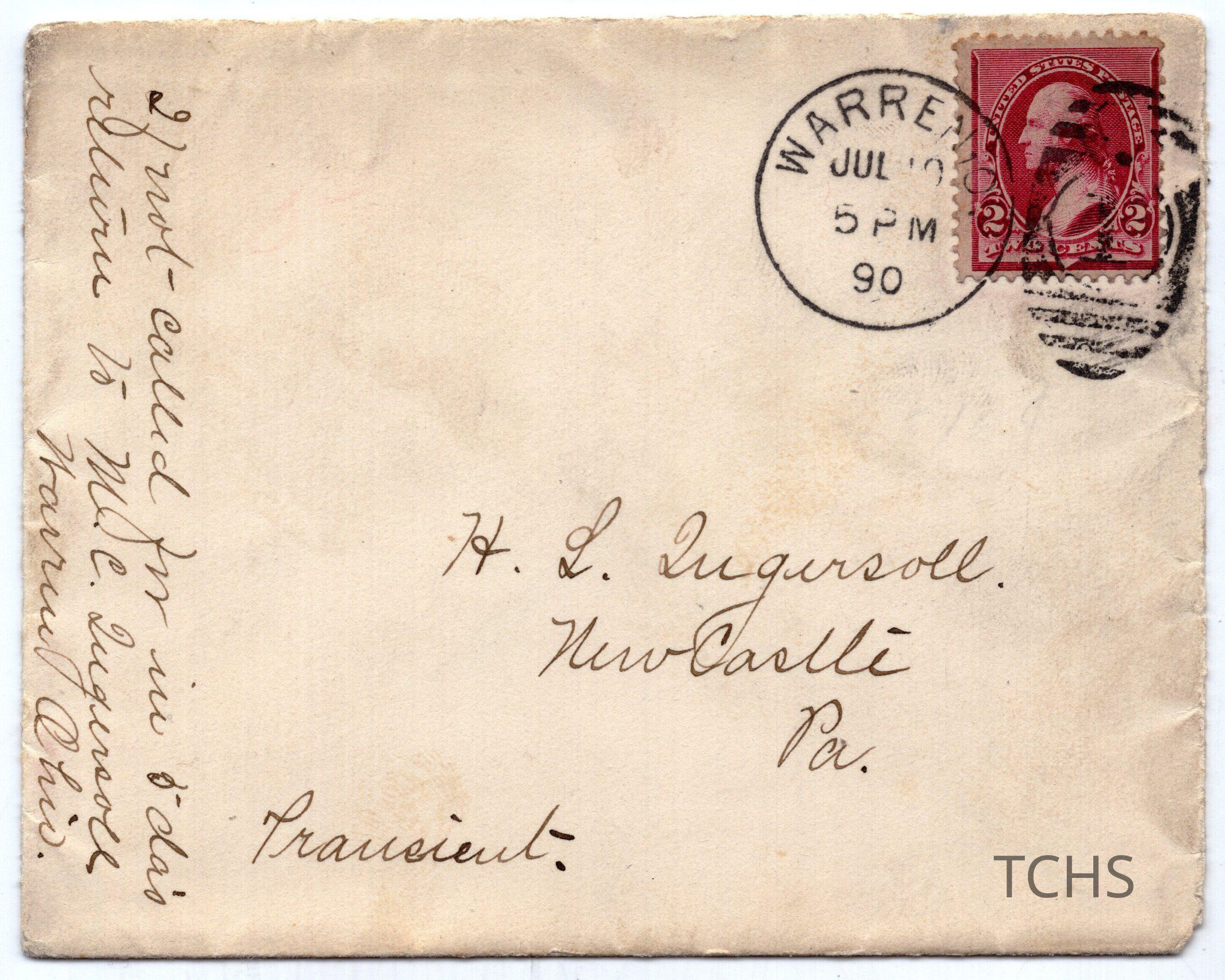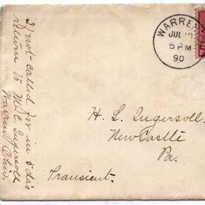 Envelope written to H.L. Ingersoll, New Castle PA. Handwritten return address from M.C. Ingersoll, Warren.Collection
