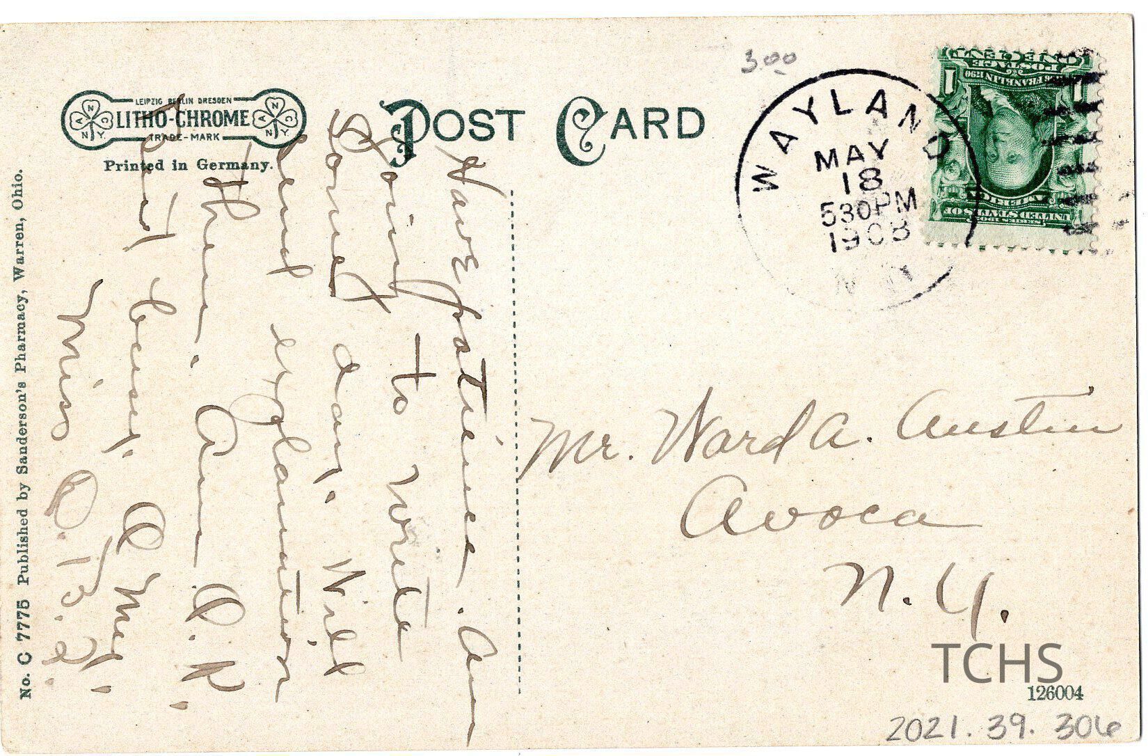 Postcard of Mahoning Ave. Addressed to Ward A. Austin from Miss D. B. Q.