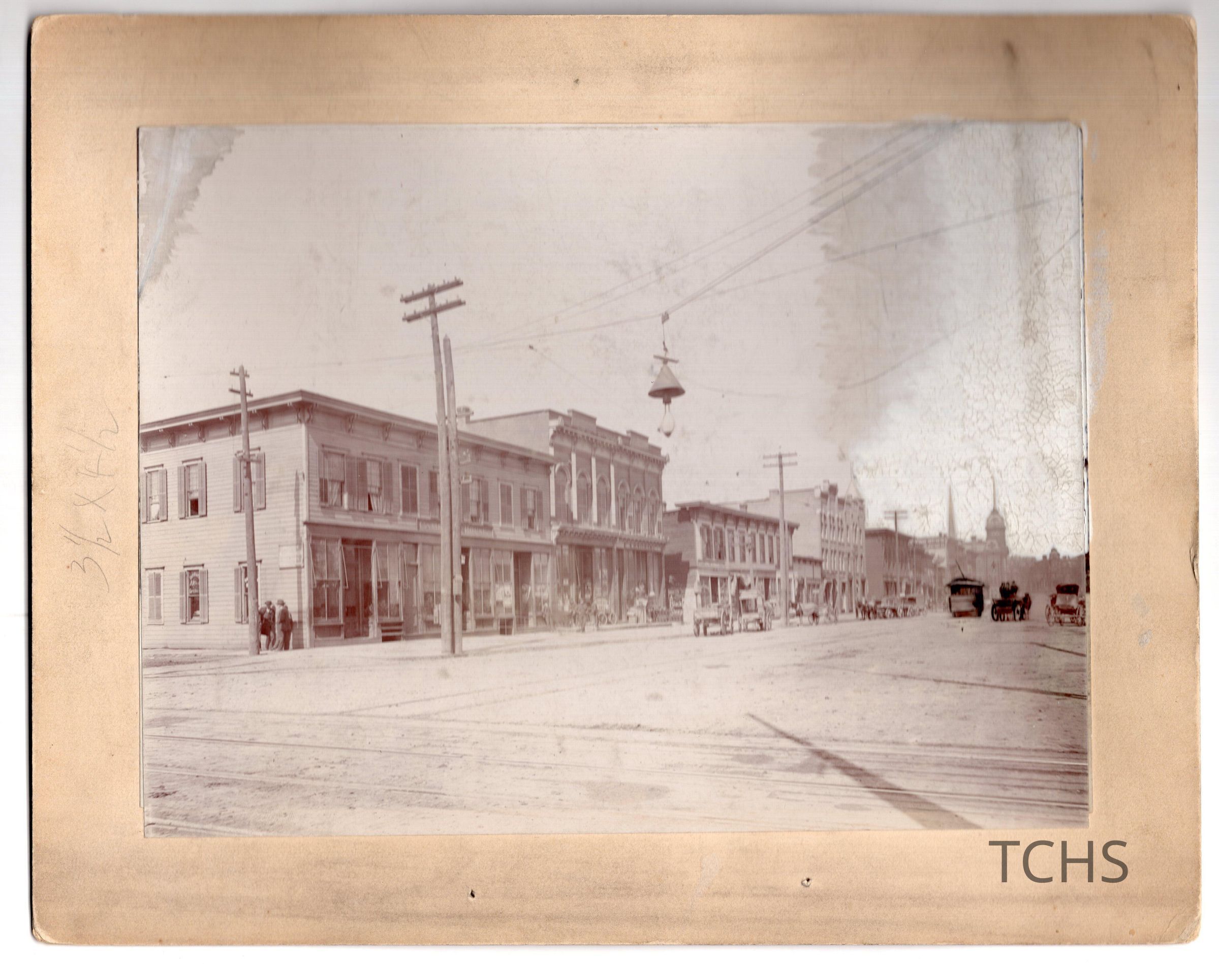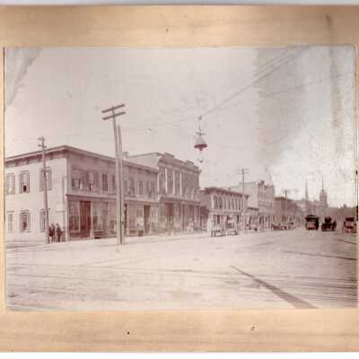 Photo on board. Main Street Looking North. A ground view. Take note of the lamp hanging above street.Collection