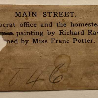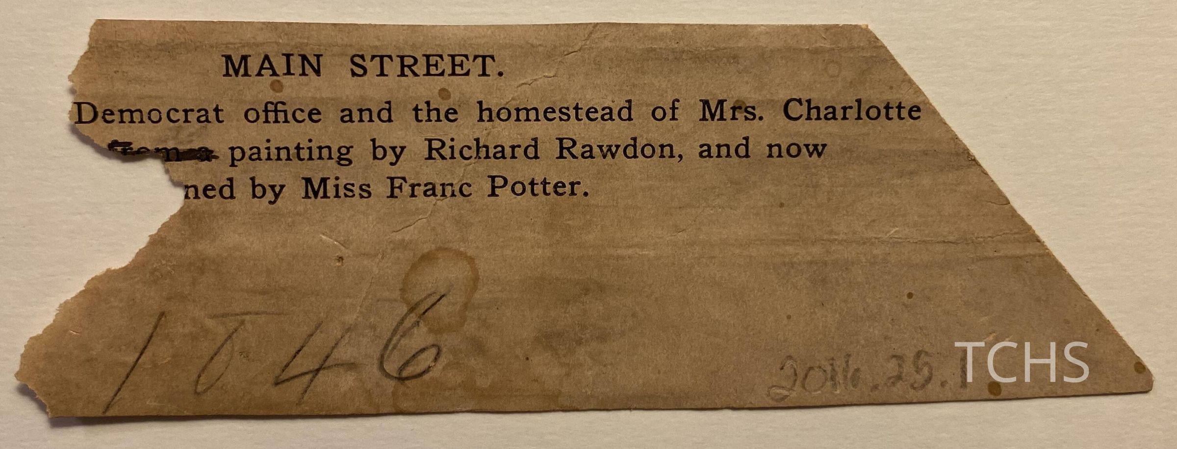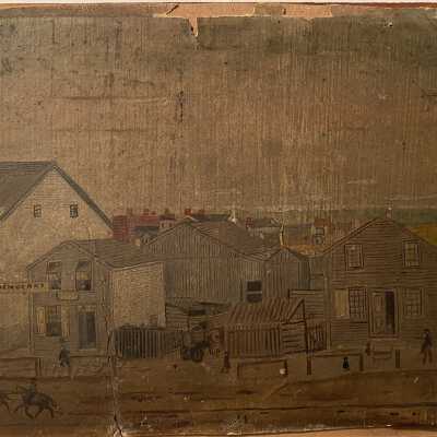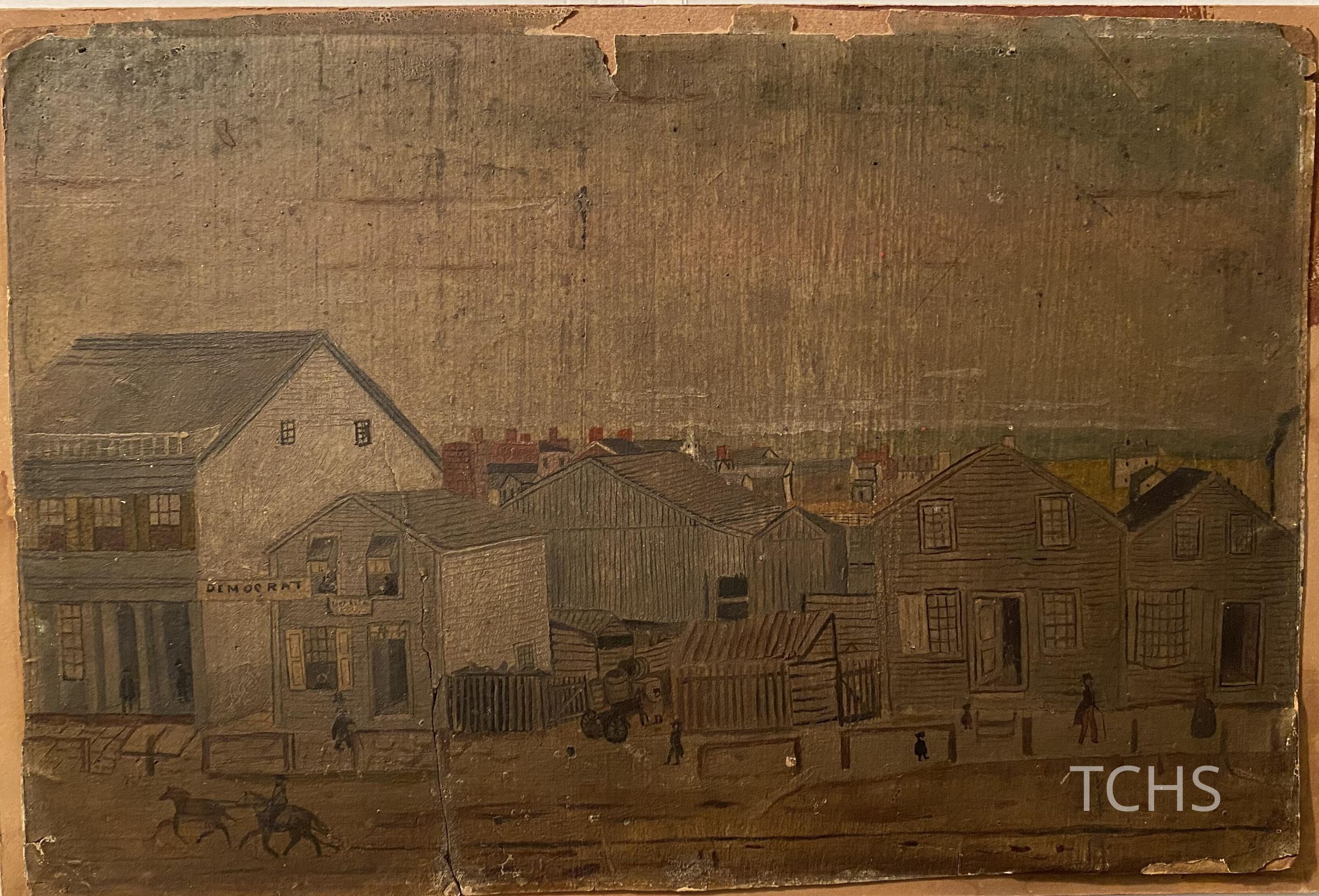 The drawing depicts Main Street in Warren, Ohio, showing the Old Democratic Office and the homestead of Mrs. Charlotte Smith. the drawing depicts Warren at the turn of the half century; the style is a forebear of Mother Moses style. The corner of Main and Market where Second National Bank is now located was at one time the site of early hotels, one proprietor being Horace Rawdon, father of the artists Richard Rawdon. In 1836, this location was purchased by Henry W. and Charles Smith, whom built a two story structure. After it burned, a three story building was erected and the second story with outside staircase was the office site of Adams Insurance Agency, Whittlesey Adams Agent.Acquisition