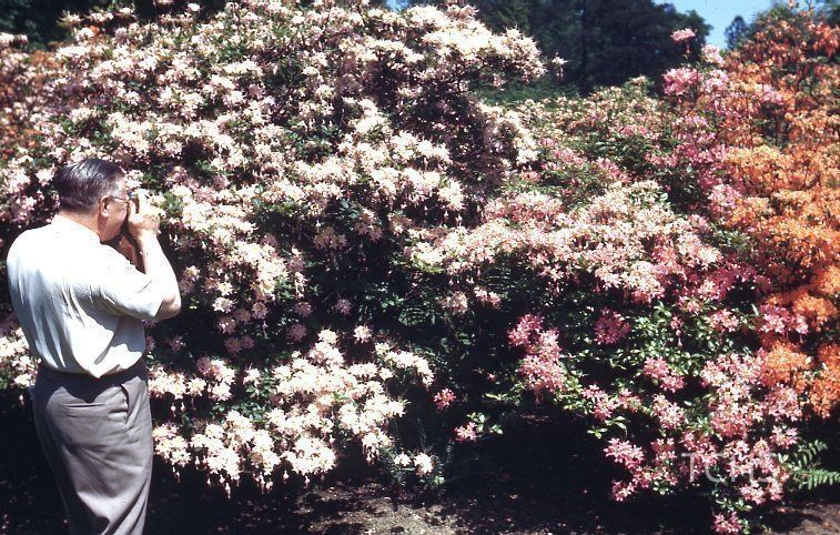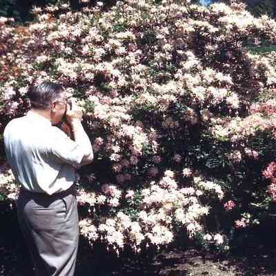 Kodachrome photo of man photographing azaleas in Perkins Park, taken May 28th, 1943 by Russell J. MontgomeryAcquisition