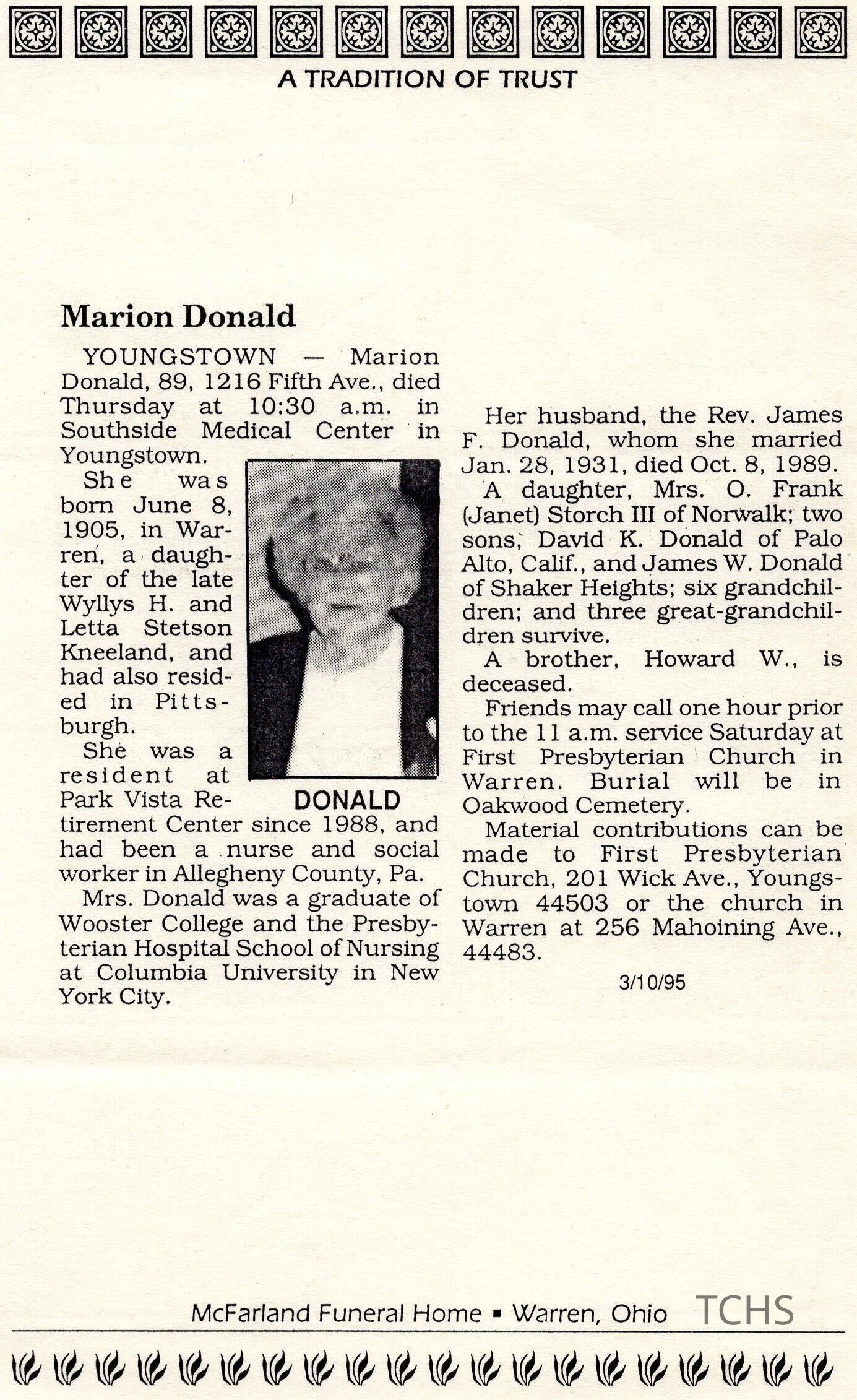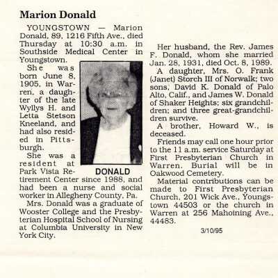 Marian K. Donald Obituary, 1995Entry/Object ID