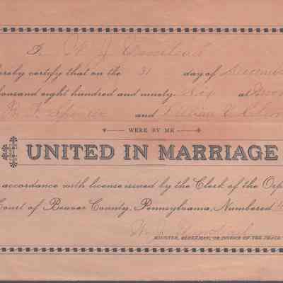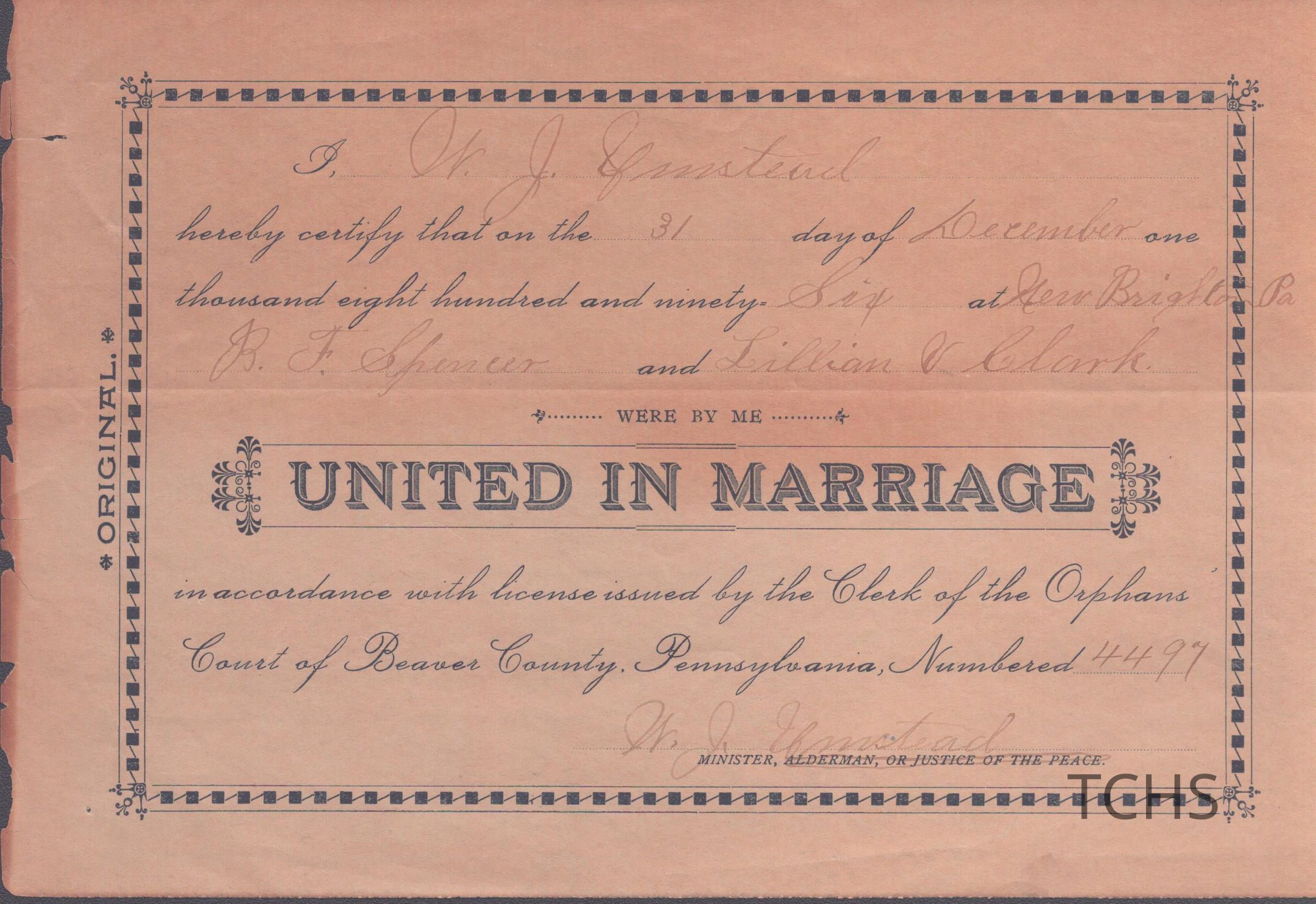 Marriage Certificate of R.F. Spencer and Lillian V. Clark. Married December 31, 1896 at New Brighton, PA.