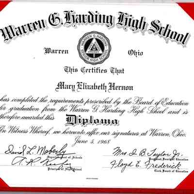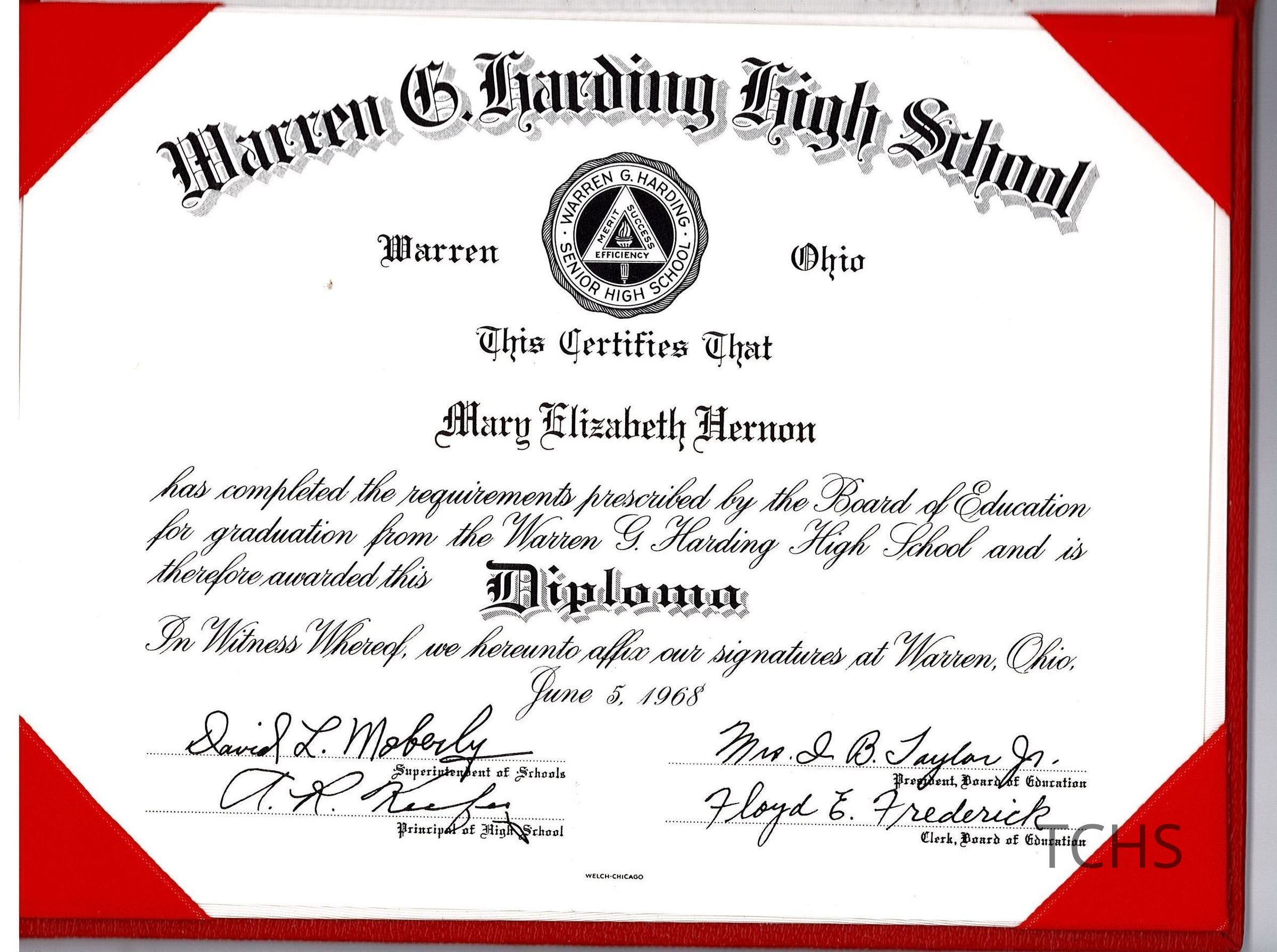 Warren G. Harding High School 1968 diploma awarded to Mary Elizabeth Hernon.Acquisition