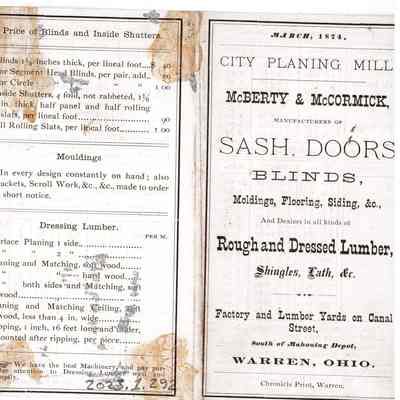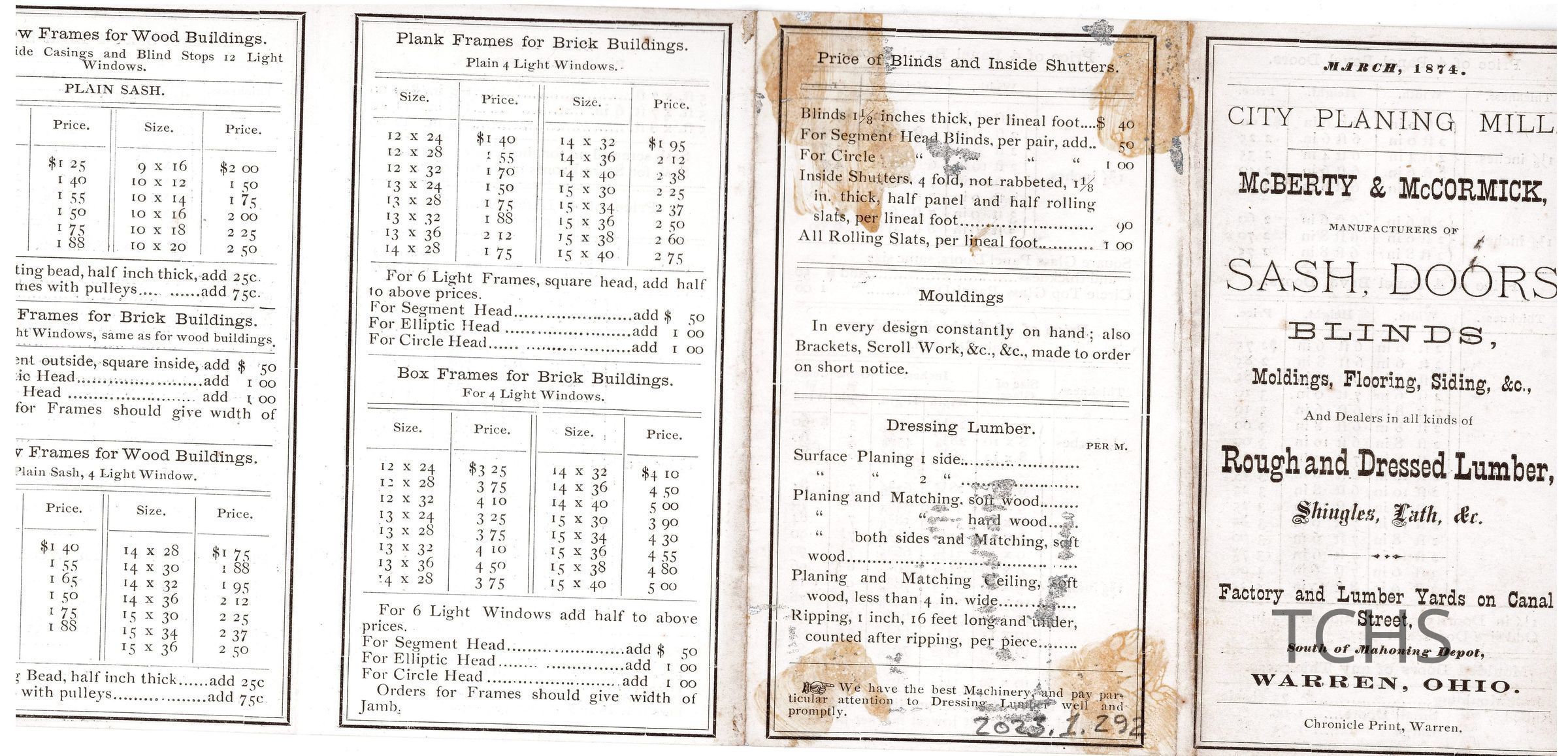 McBerty & McCormick Manufacturer of Sash, Doors, Blinds, Moldings, Flooring, Siding, & C. Services Price Guide, undated. Printed by the Chronicle Print of Warren.Archive Details