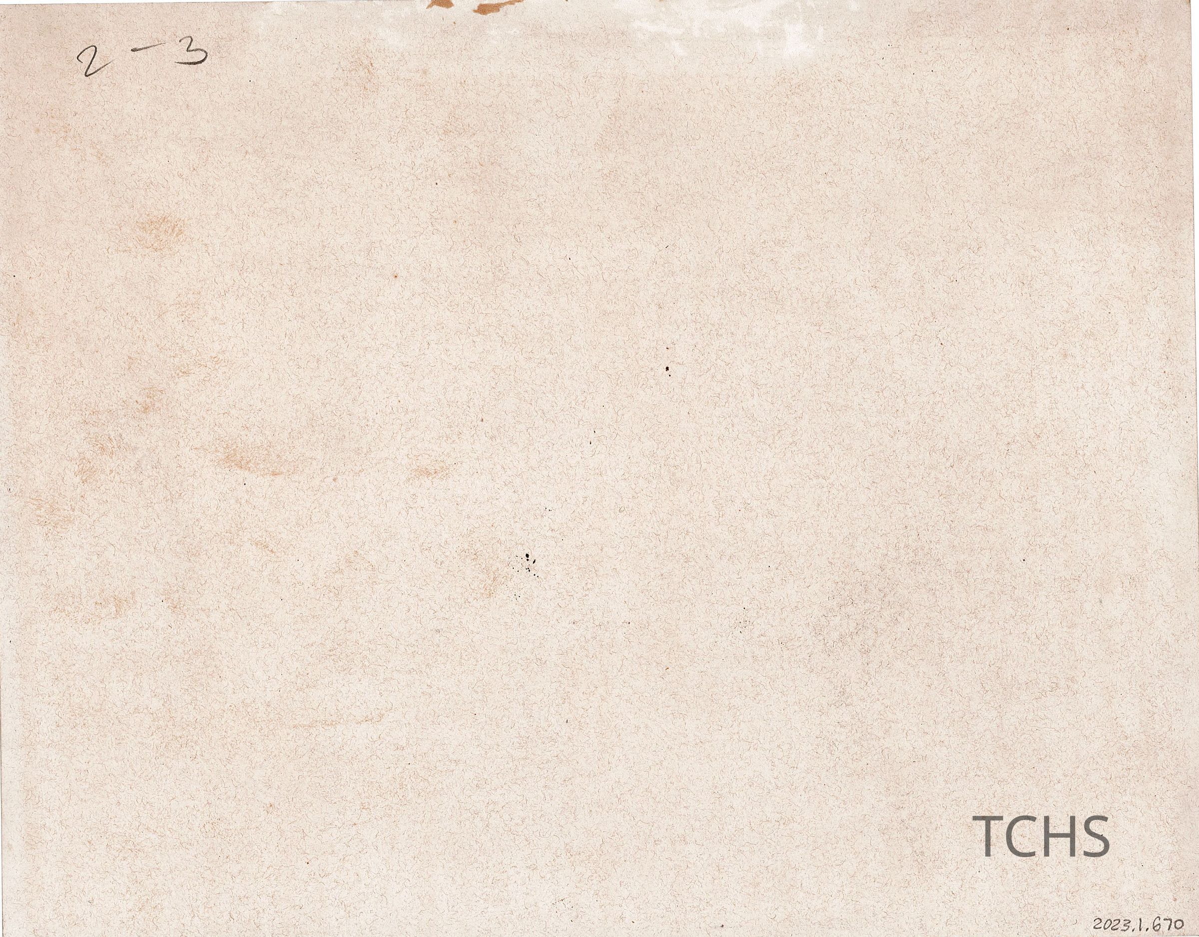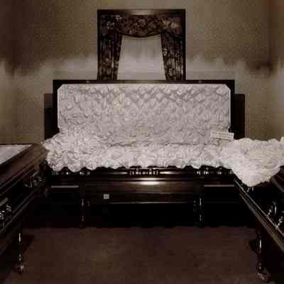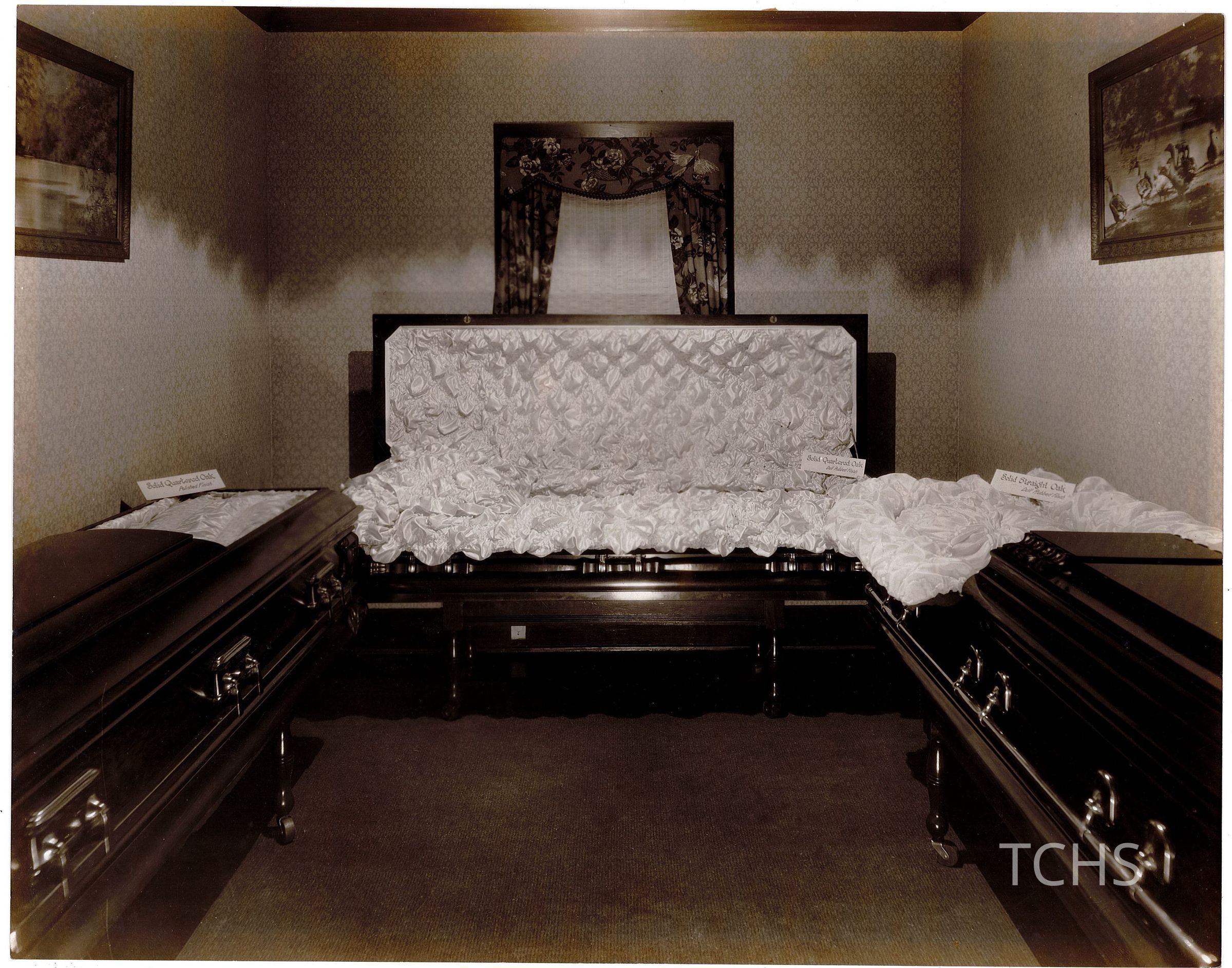 Photo of a McFarland & Son casket display room. On the leftmost side there is a casket labeled "Solid Quartered Oak. Polished Finish." The one in the center is open completely and labeled "Solid Quartered Oak. Dull Rubbed Finish." The one on the rightmost side is labeled "Solid Straight Oak. Dull Rubbed Finish." "2-3" is written on the back. Undated.Location