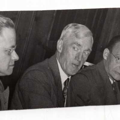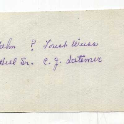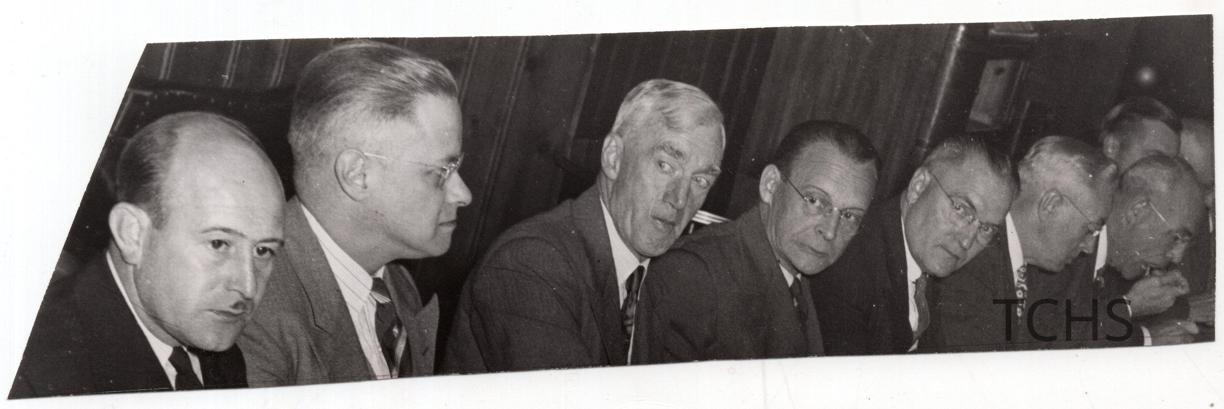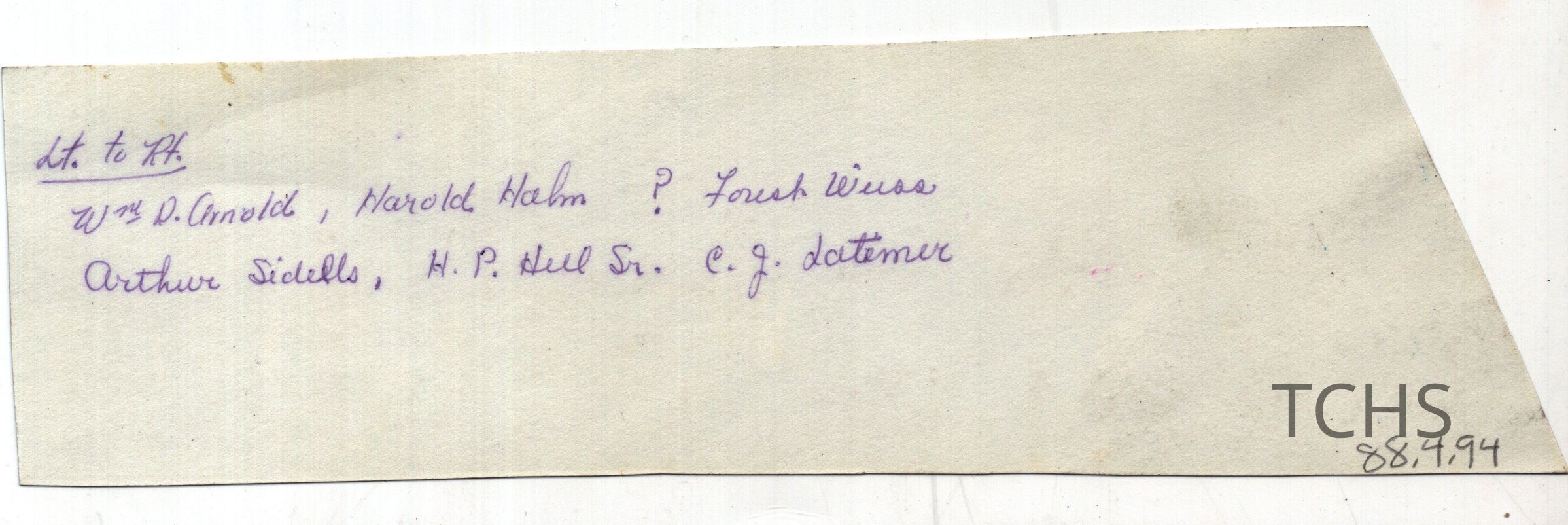 Cropped image of men at a table. Names written on back, William D. Arnold, Harold Hahn, Foust Weiss, Arthur Sidells, H.P. Heel Sr., & C. J. Latimer