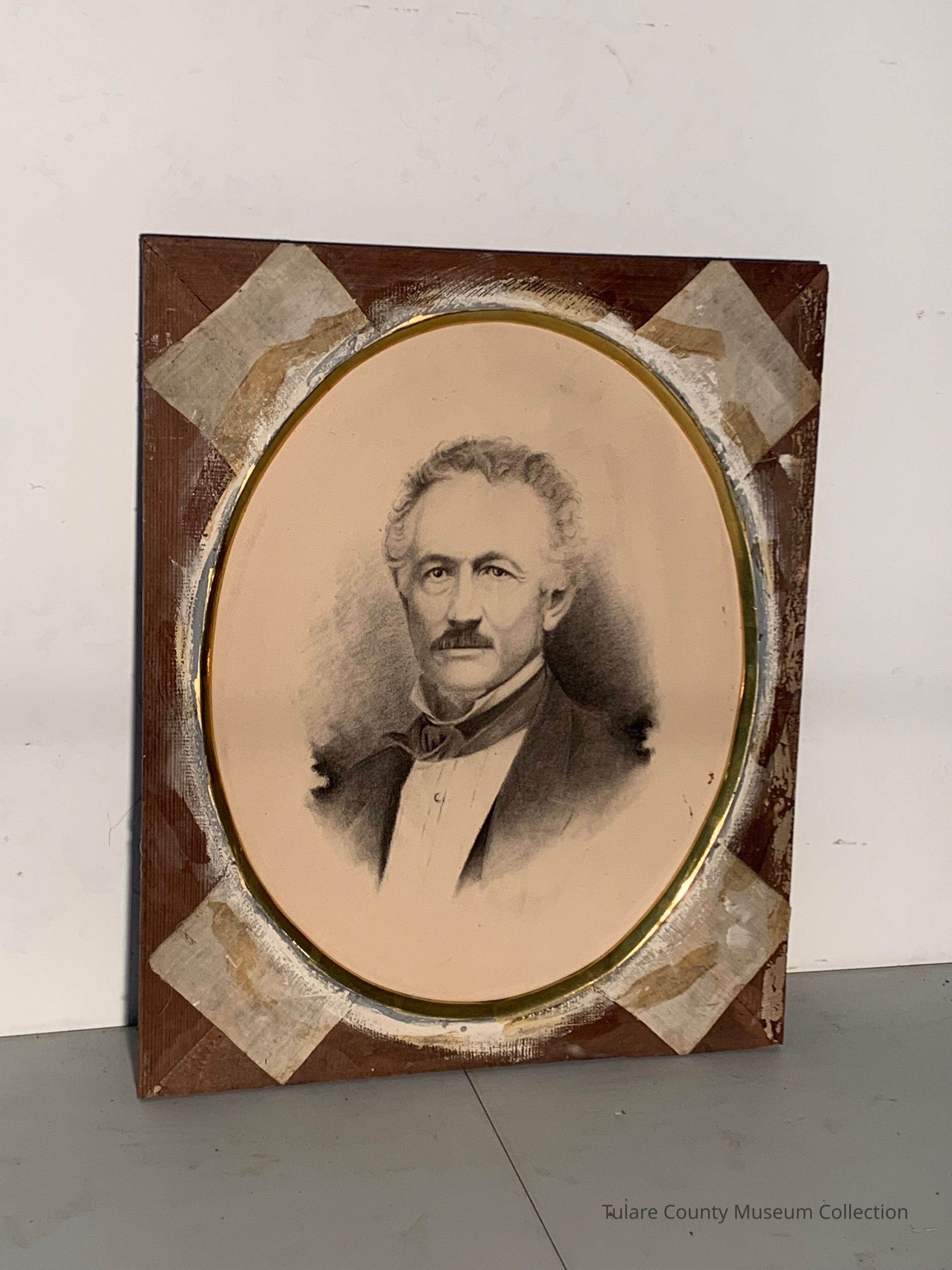 Charcoal pencil drawing of man in a suit, with a mustache. frame in poor condition.