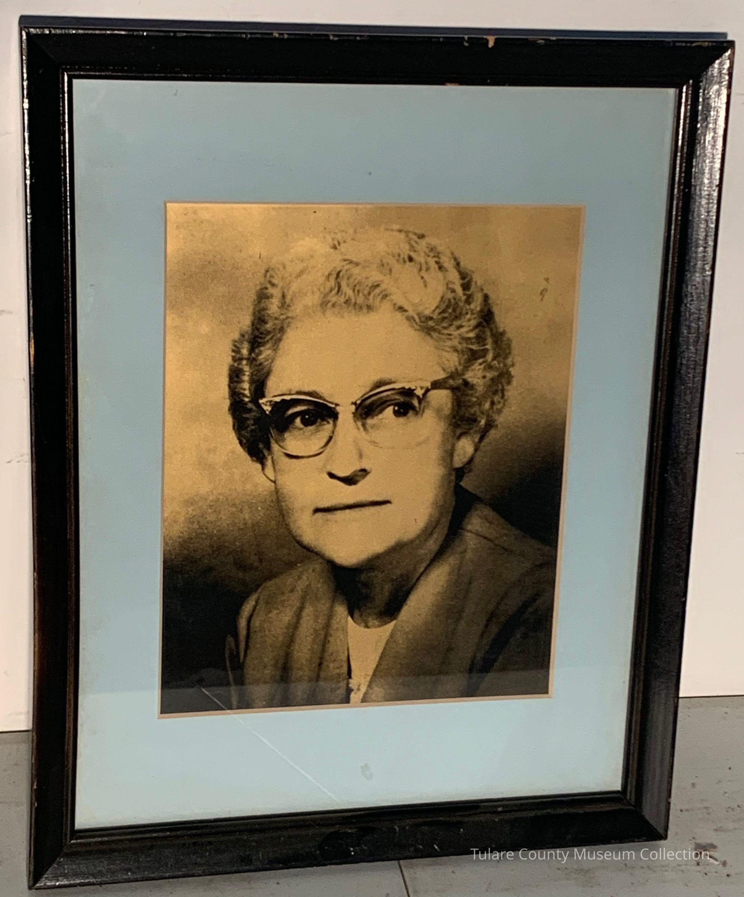 Portrait photograph of Annie Mitch surrounded with blue boarding and brown frame.