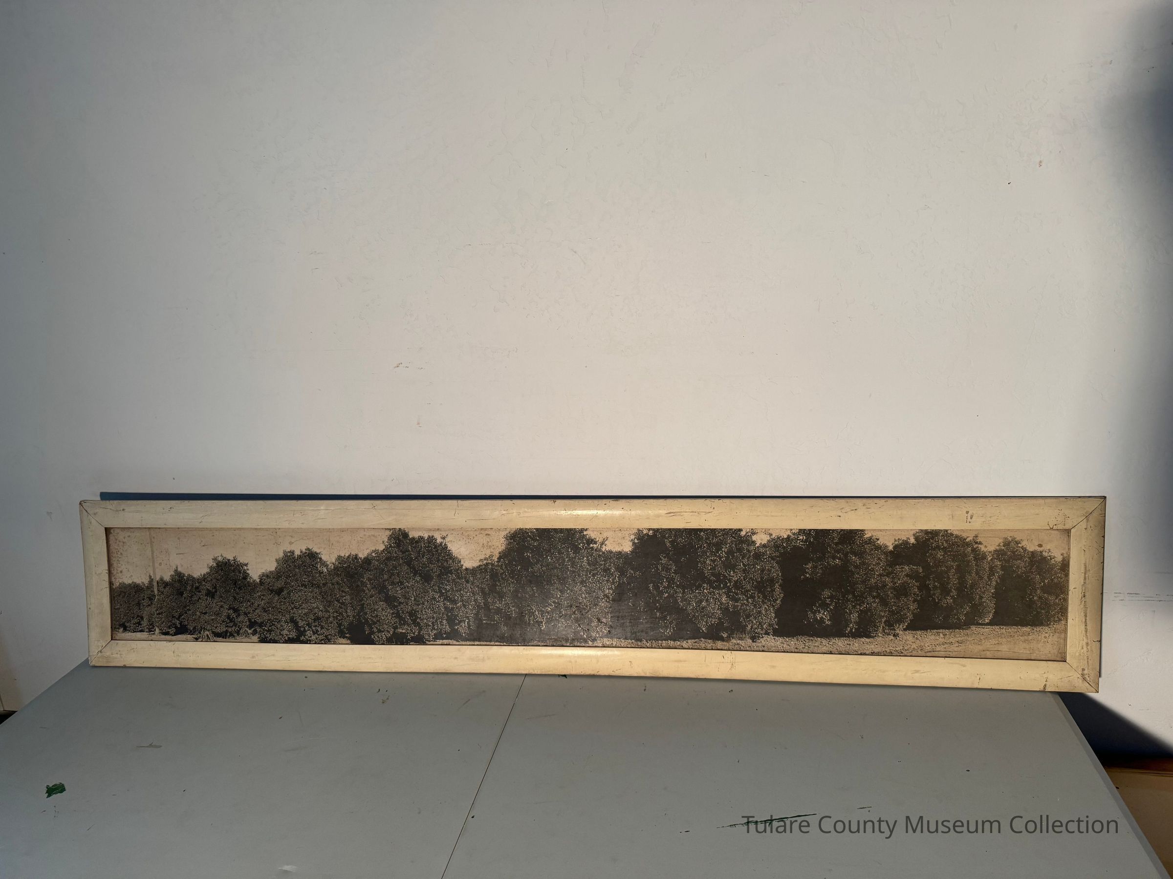 Black and white panoramic close of photo of (seemingly) orange trees. White frame.