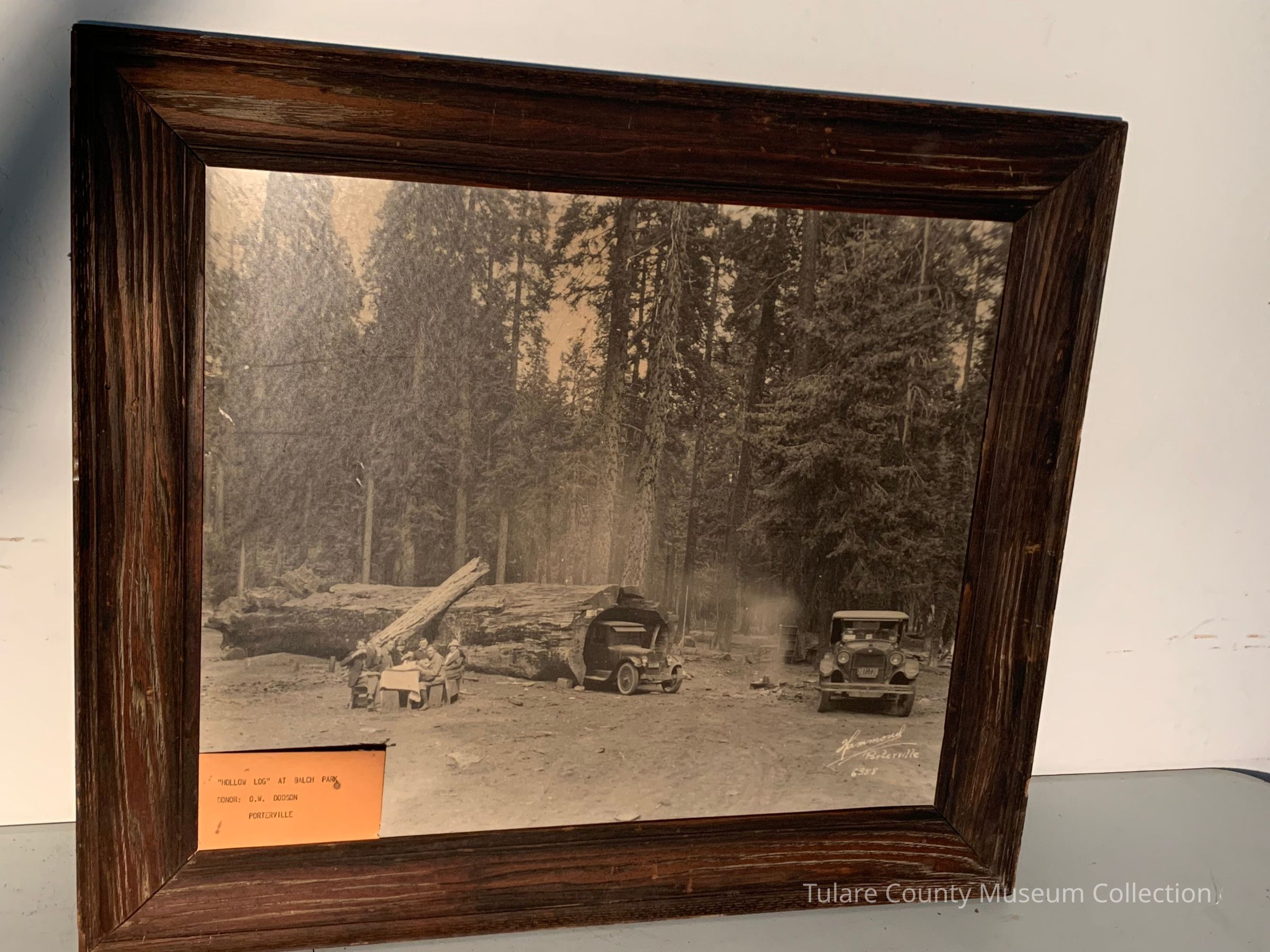 Framed, Black and White photo of "Hollow Log" at Balch Park, Donor: O.W Dodson, Porterville.