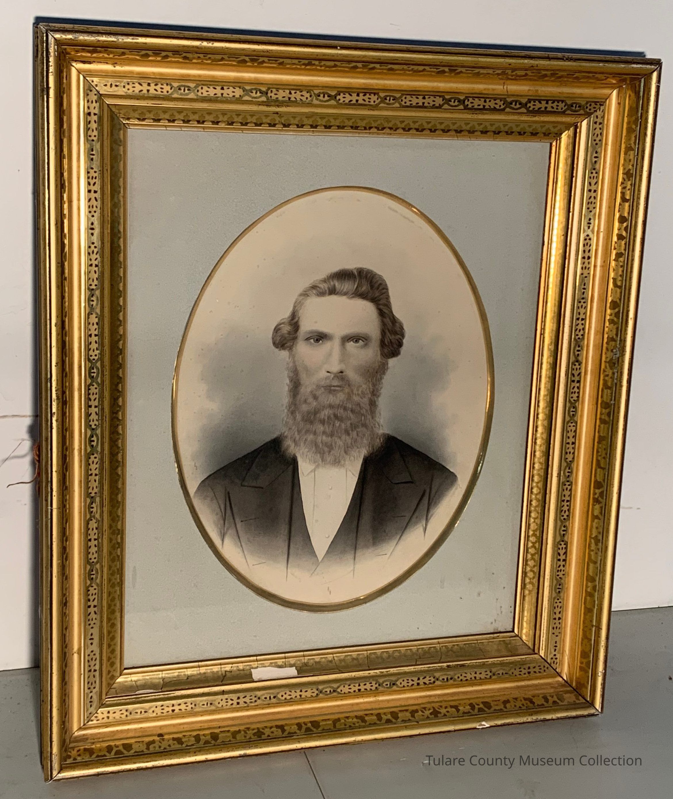 Framed sketch with watercolor of a man in a suit, with a light blue background and oval boarding.