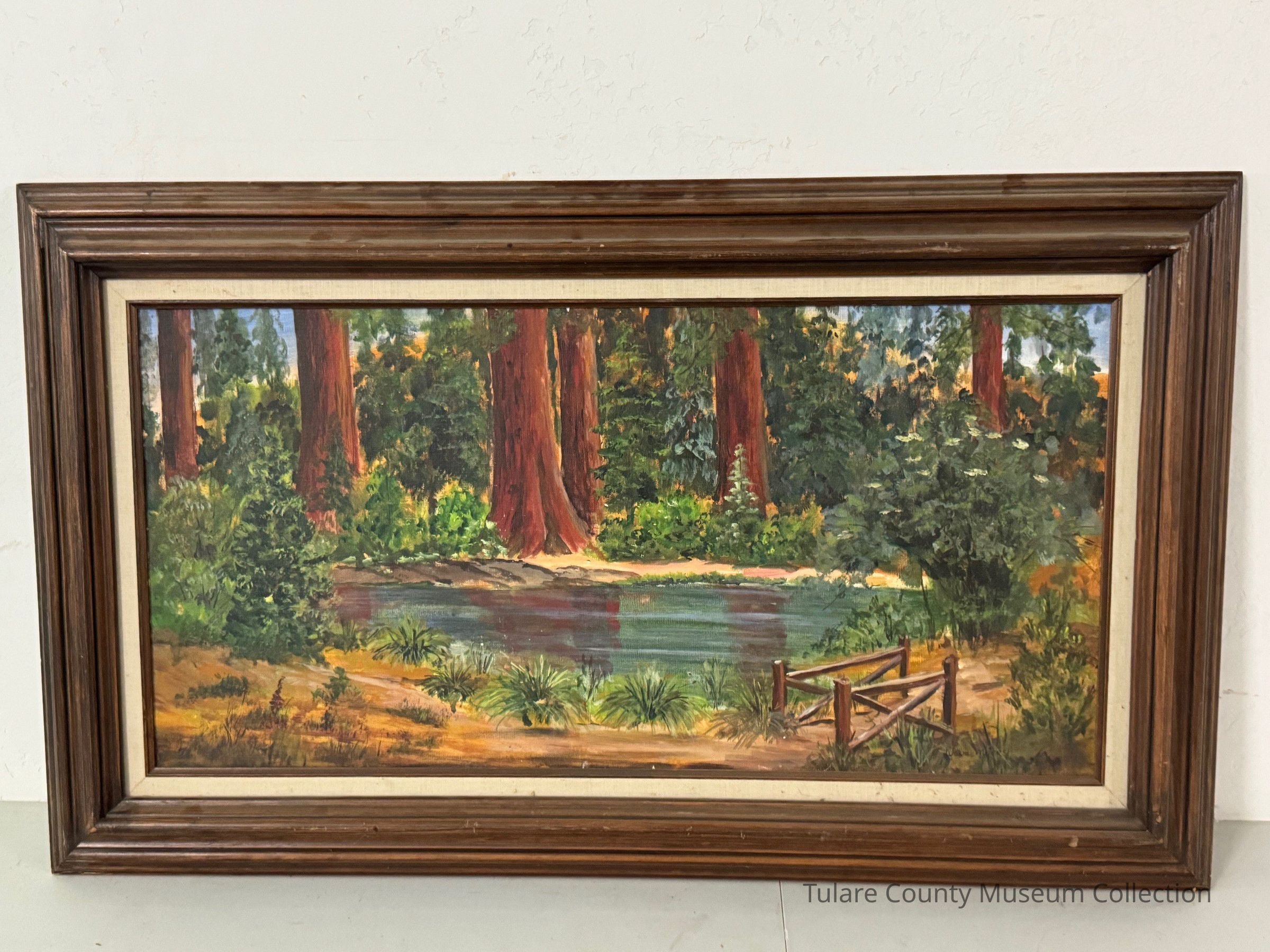 Vibrant framed painting of small body of water surrounded by sequoia trees, and a path with fencing on the lower right-hand side of the painting.