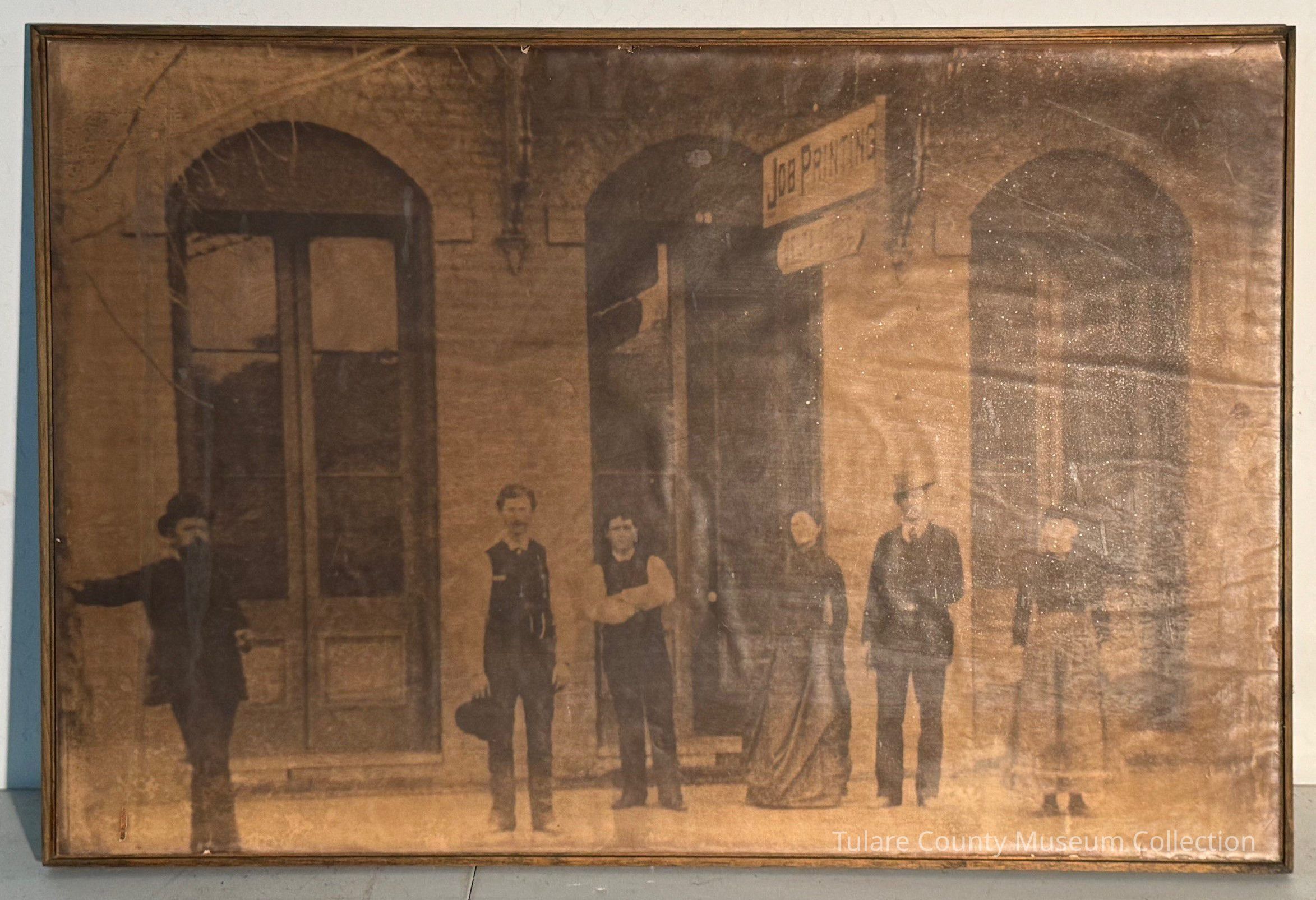 Black and white photograph of people standing outside building, sign that says "Job Printing."