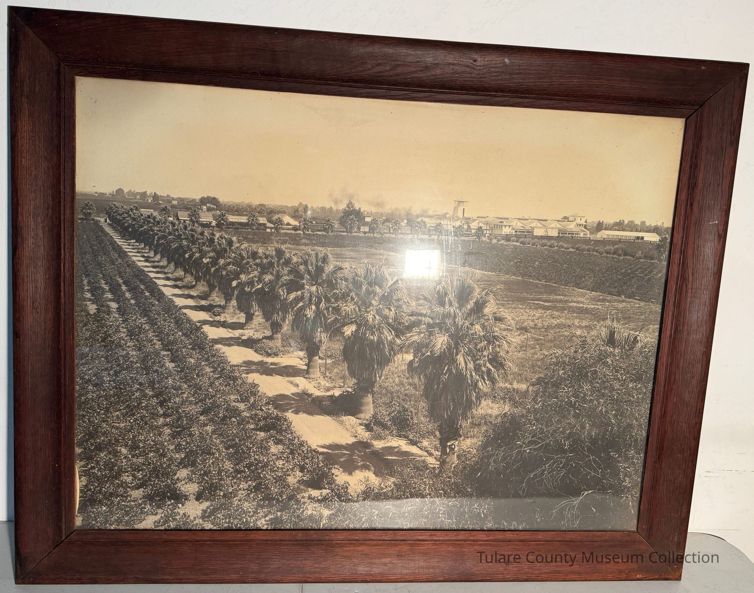Framed black and white photograph. Orchards, palm trees, houses, and a factory with plumes of smoke are captured.