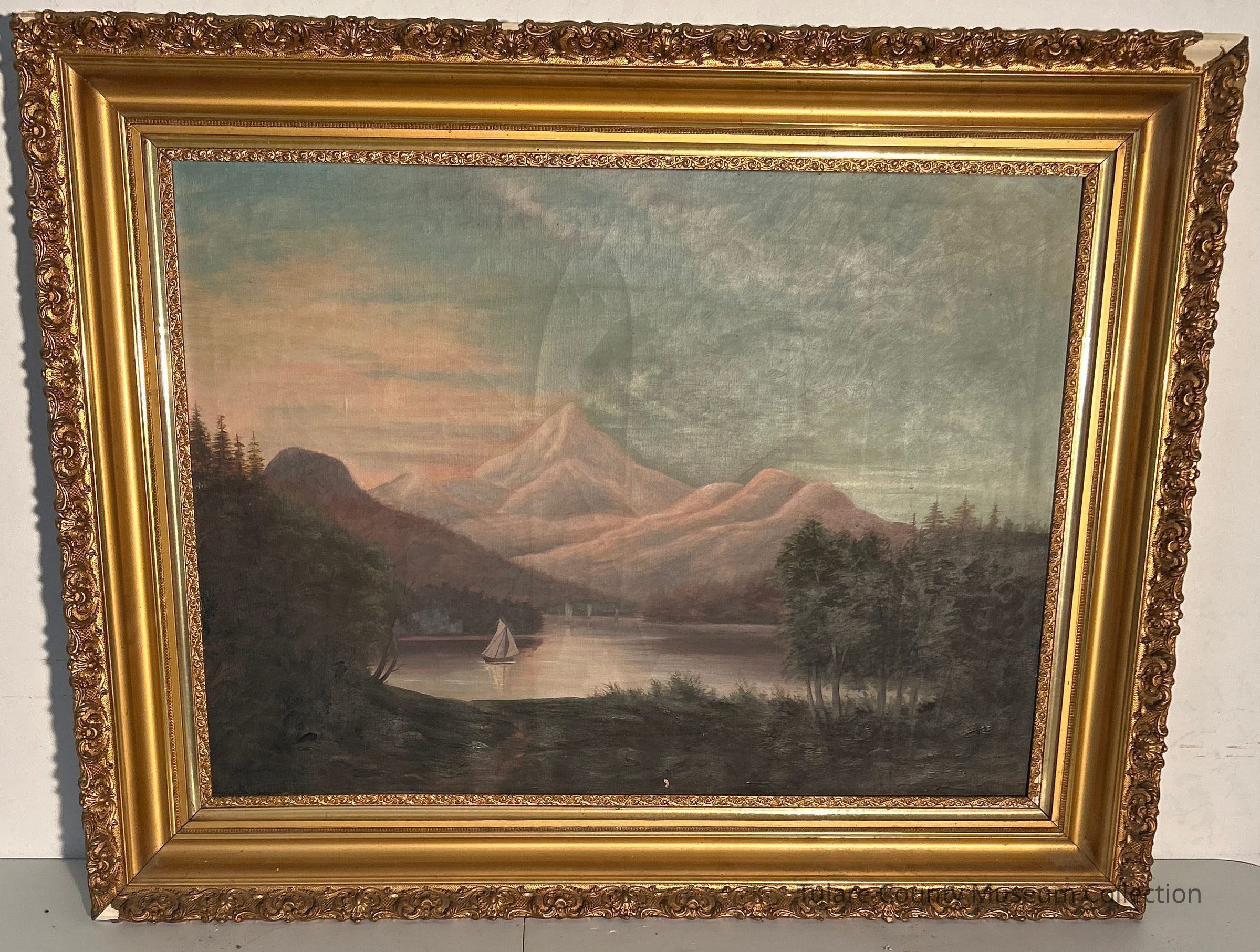 (1) Ornate Gold-gilt framed scenic painting, 45"x36". Lake with sail boats. Painted by Mrs. L.O. Cutler in 1905. Mint Condition