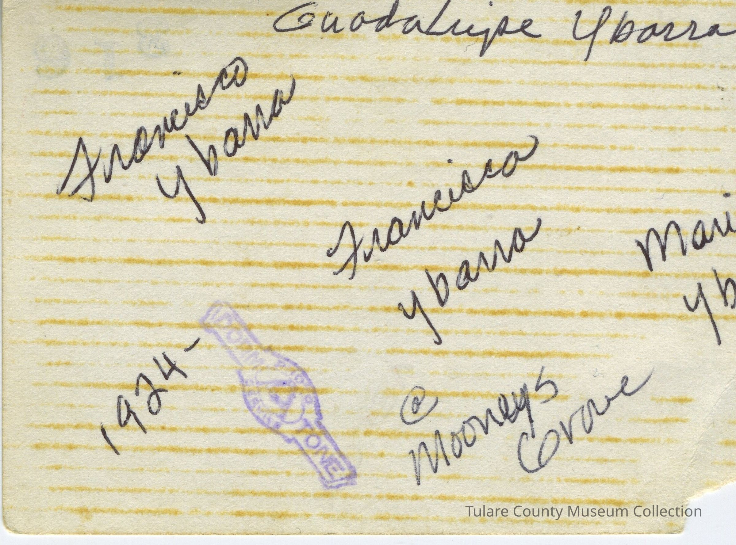 Taken in Mooney Grove circa early 1930s Front: Guadalupe Ybarra, Francisco Ybarra - donor's mother and father Middle: Felicidades (went by Fita), Rosario - donor's aunts Back: unknown, Antonio Ybarra