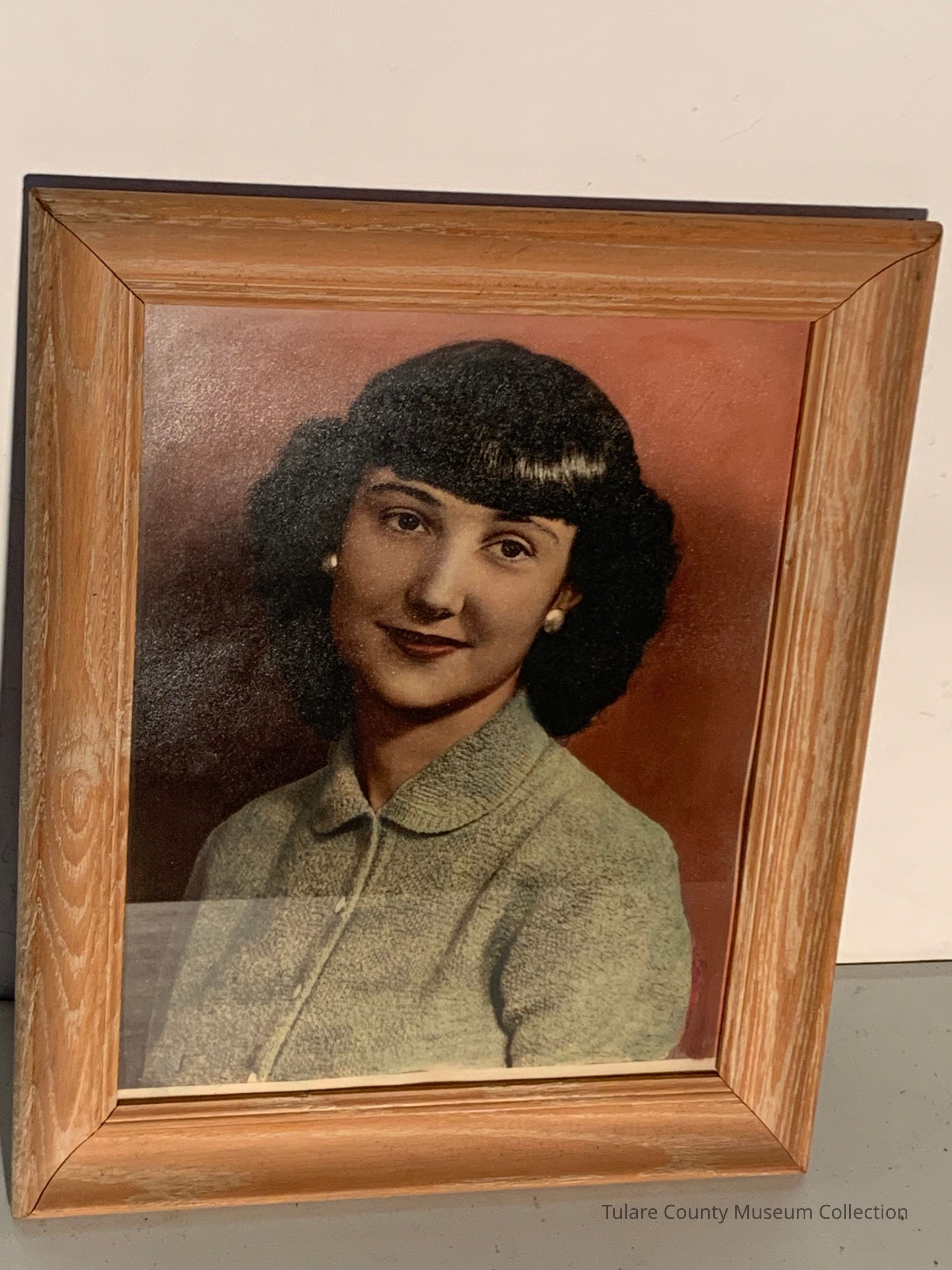 Colorized photograph of woman with dark hair and bangs in a green blouse. Framed.