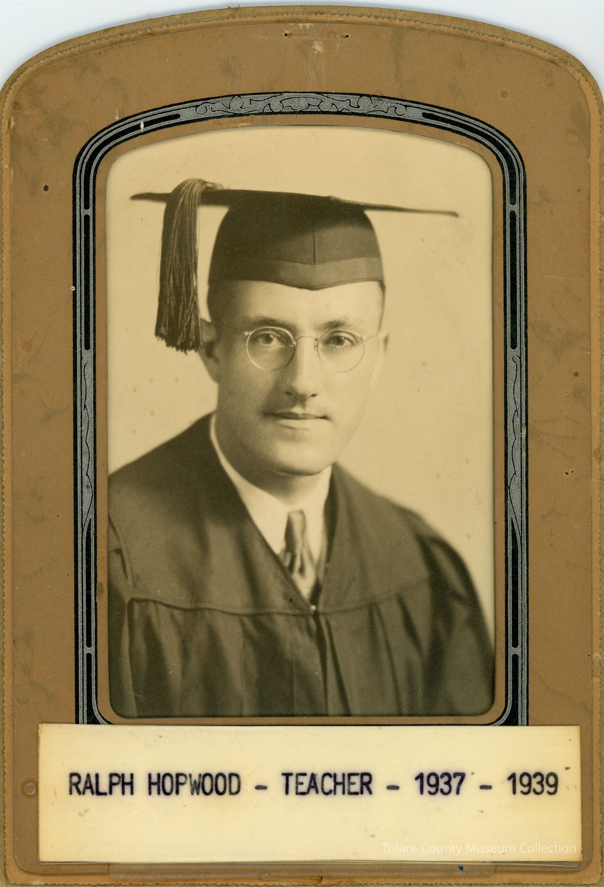 Professional graduation portrait of a young man in his commencement cap and gown. The man is identified by a label on the bottom of the photo as "Ralph Hopwood- Teacher- 1937-1939"