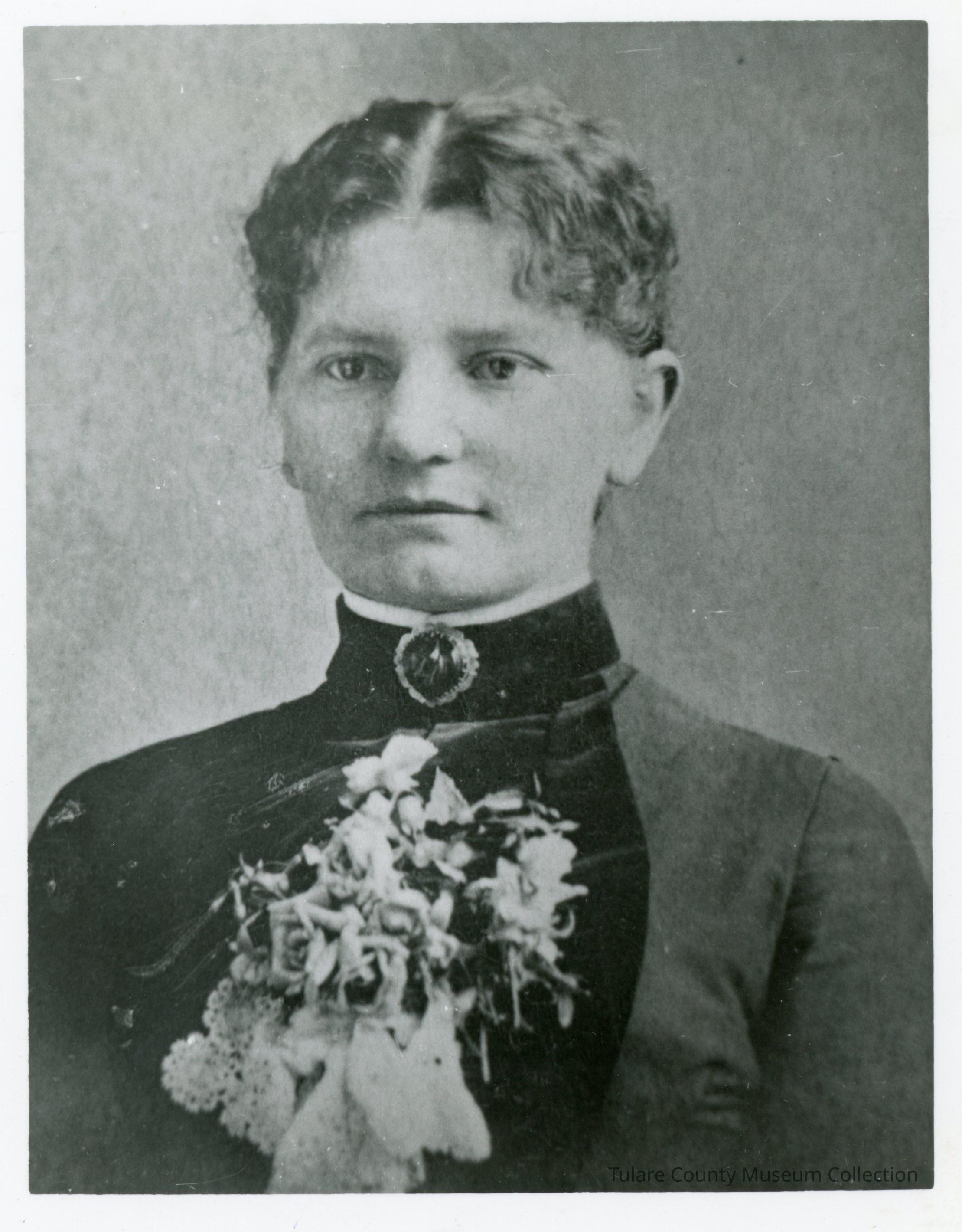 (1) Black and white portrait of a young woman formally dressed in a turtle neck dress. A series of small roses are pinned down the top center of the dress. The woman's hair is parted in the center and pulled back into a bun.