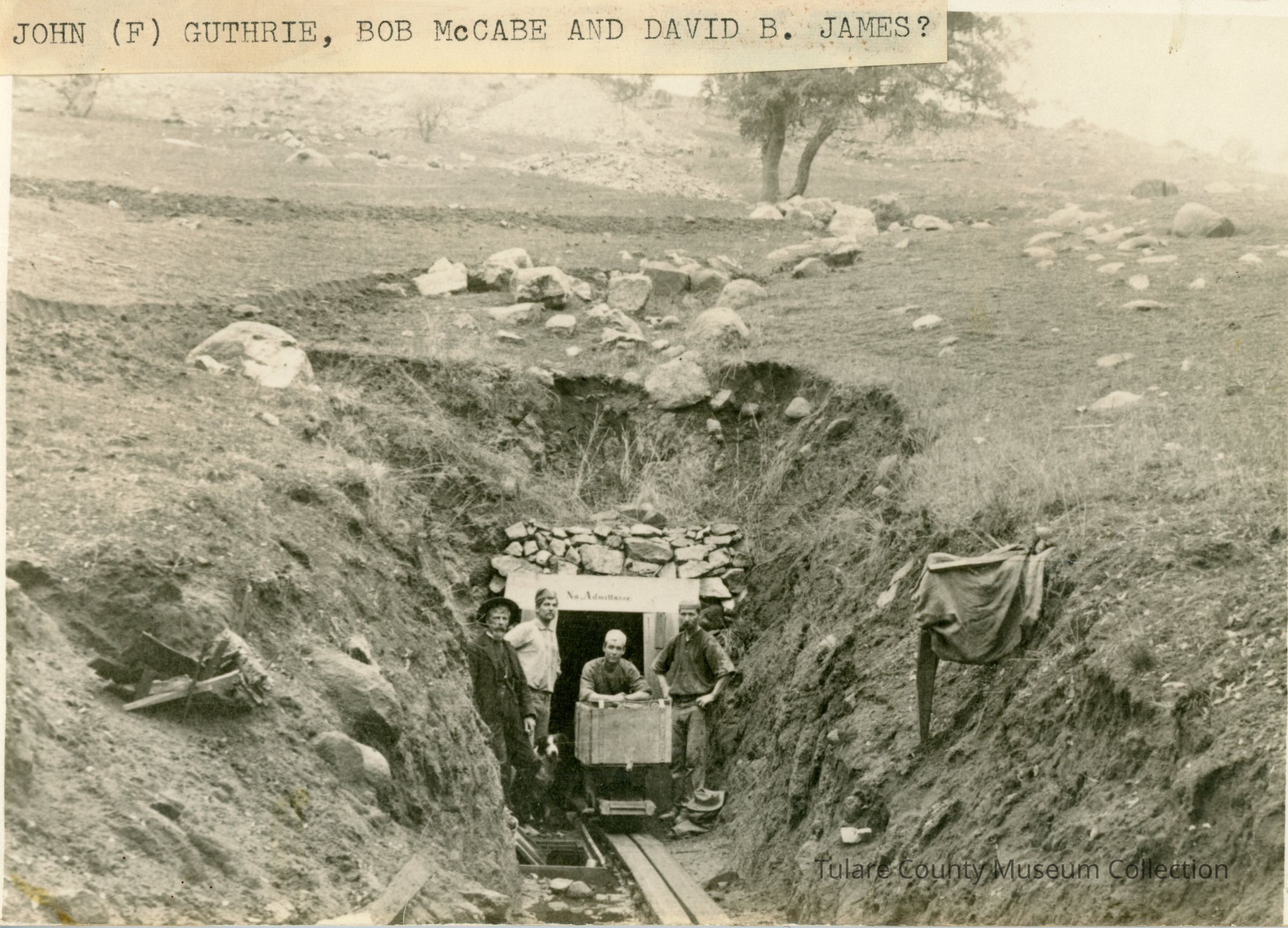 Four men and a dog stand at the entrance of a mine. One man is hunched over a cart. The individuals are identified as: John (F) Guthrie, Bob McCabe and David B. James?